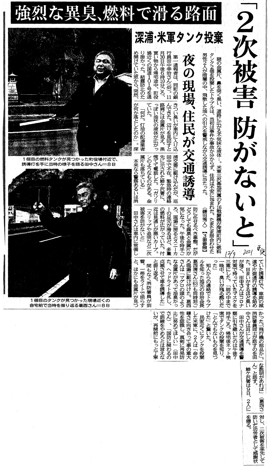 | [2021_12_09_01]深浦・米軍タンク投棄 強烈な異臭、燃料で滑る路面 「2次被害 防がないと」 夜の現場、住民が交通誘導(東奥日報2021年12月9日) |