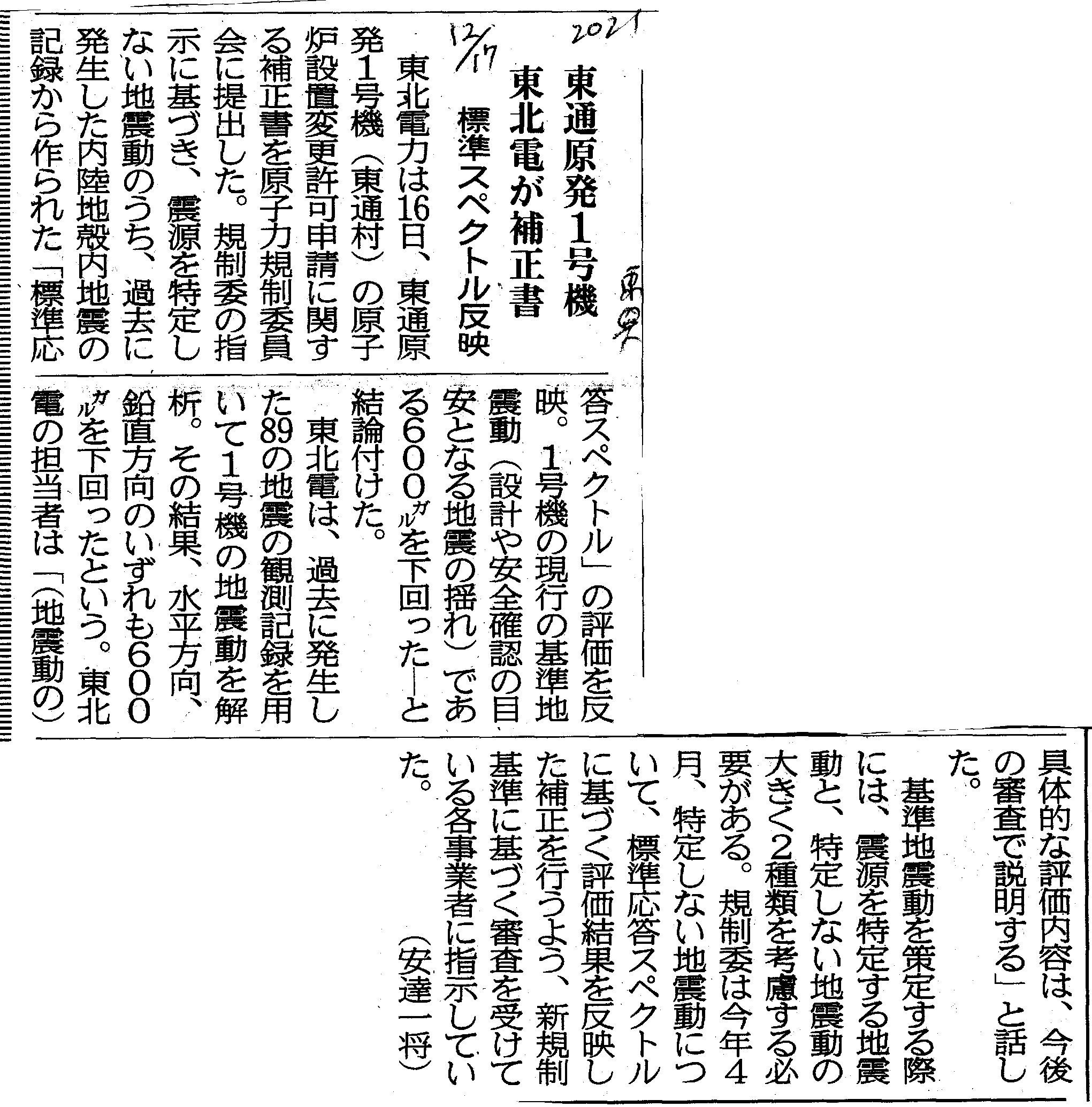 | [2021_12_17_04]東通原発1号機 東北電が補正書 標準スペクトル反映(東奥日報2021年12月17日) |