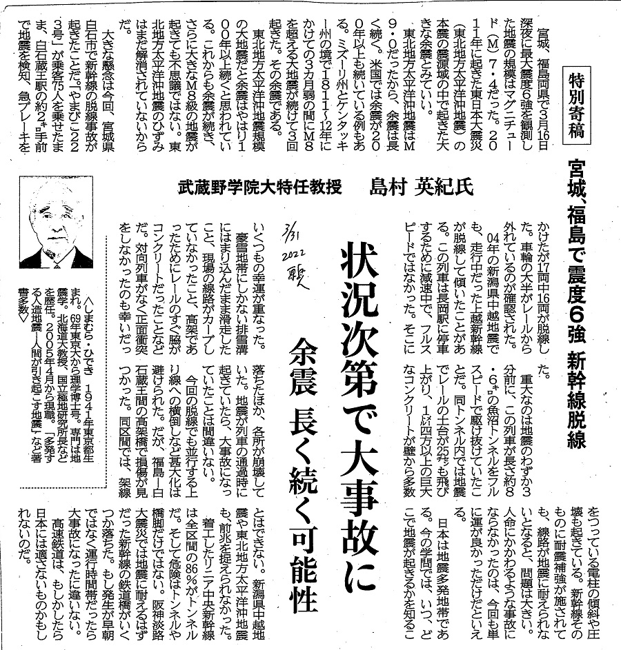 | [2022_03_31_12]特別寄稿 宮城、福島で震度6強 新幹線脱線 状況次第で大事故に 余震 長く続く可能性 武蔵野学院大特任教授 島村英紀氏(東奥日報2022年3月31日) |