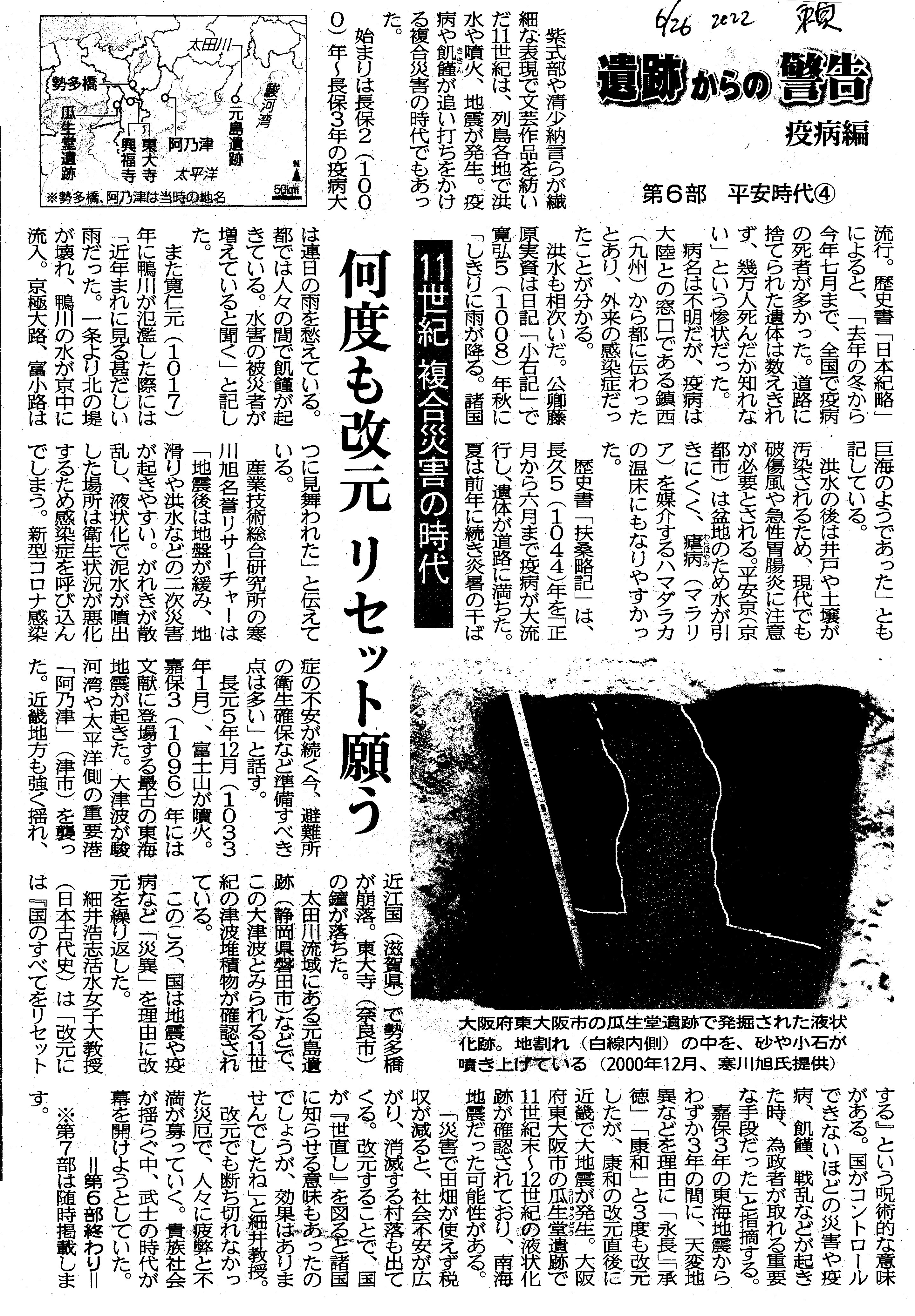 [2022_06_26_04]遺跡からの警告 疫病編 第6部平安時代(4) 11世紀 複合災害の時代 何度も改元 リセット願う(東奥日報2022年6月26日)