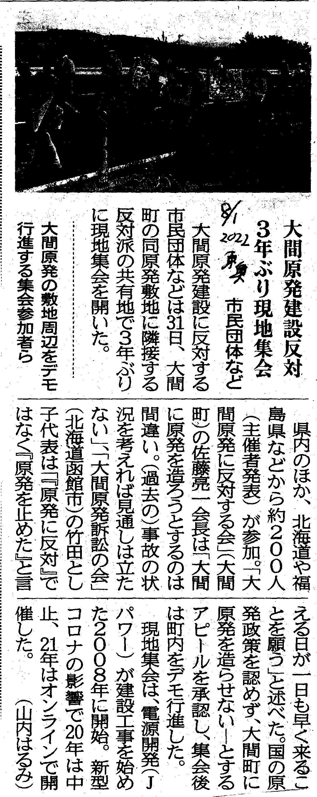 [2022_08_01_01]大間原発建設反対 3年ぶり現地集会 市民団体など(東奥日報2022年8月1日)