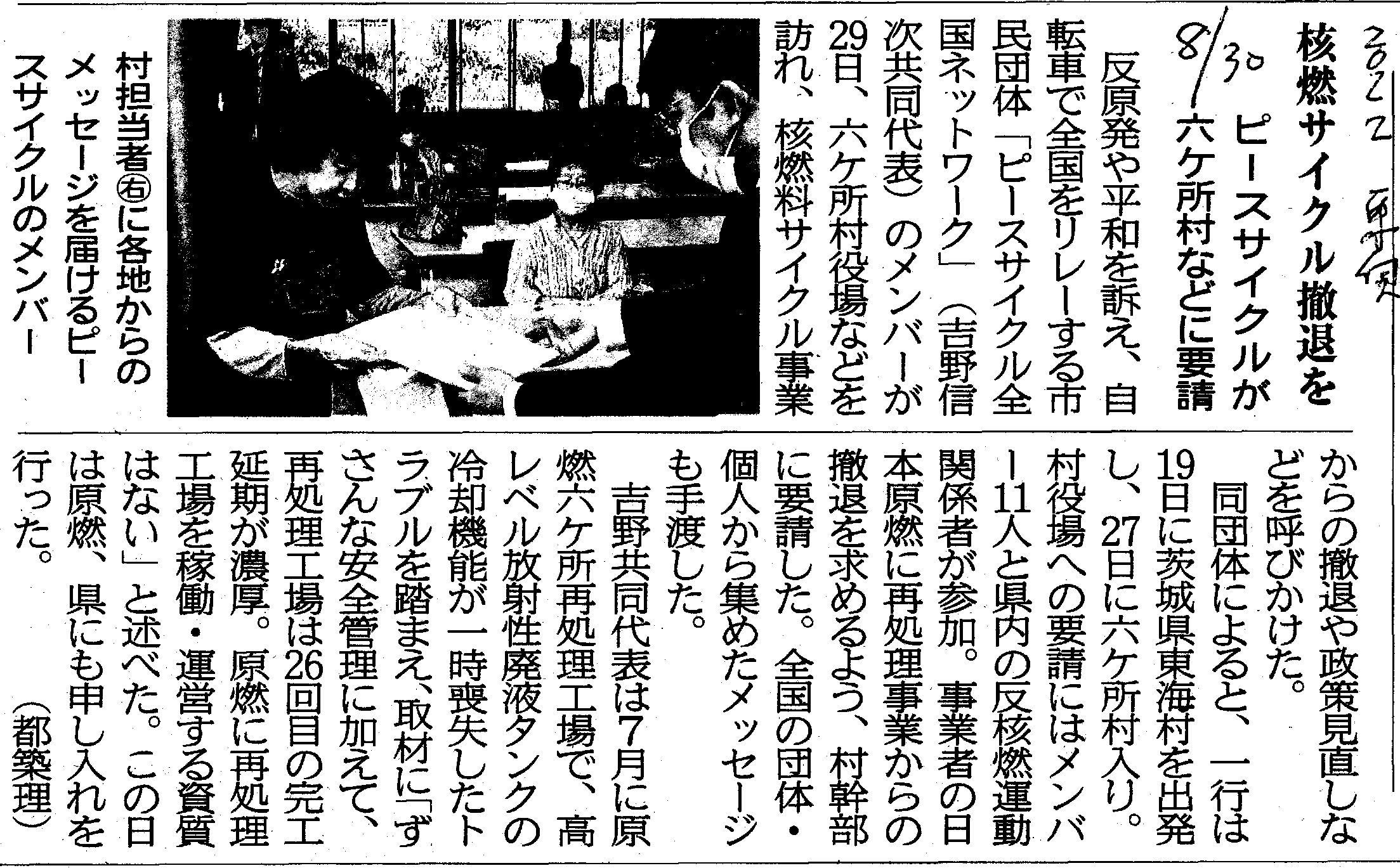 [2022_08_30_09]核燃サイクル撤退を ピースサイクルが六ヶ所村などに要請(東奥日報2022年8月30日)