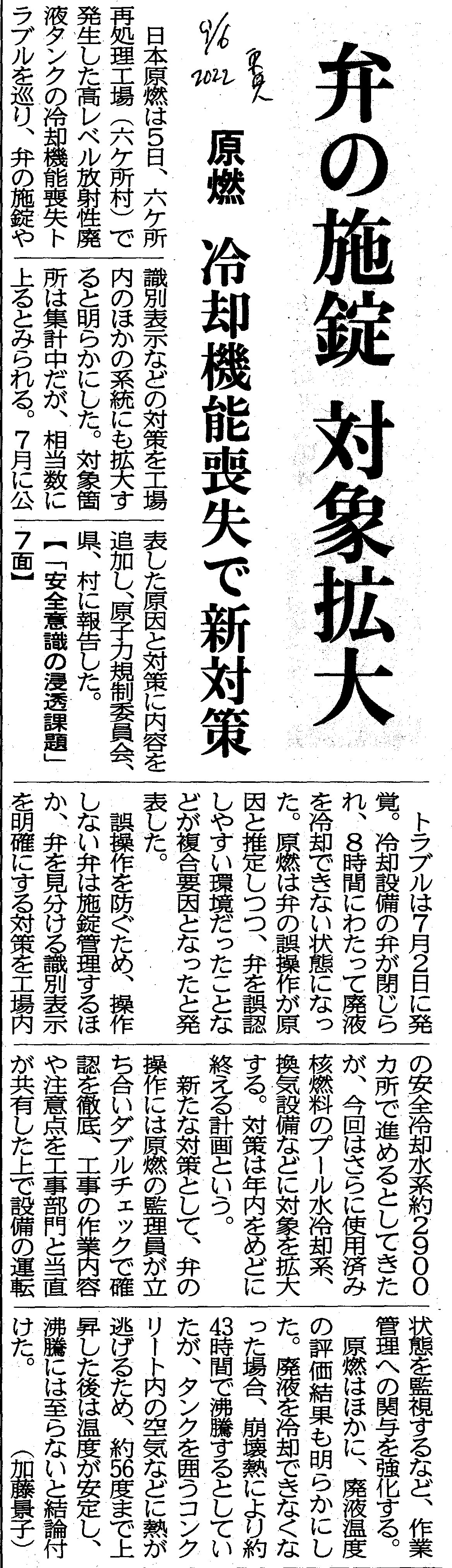 | [2022_09_06_11]弁の施錠 対象拡大 原燃 冷却機能喪失で新対策(東奥日報2022年9月6日) |