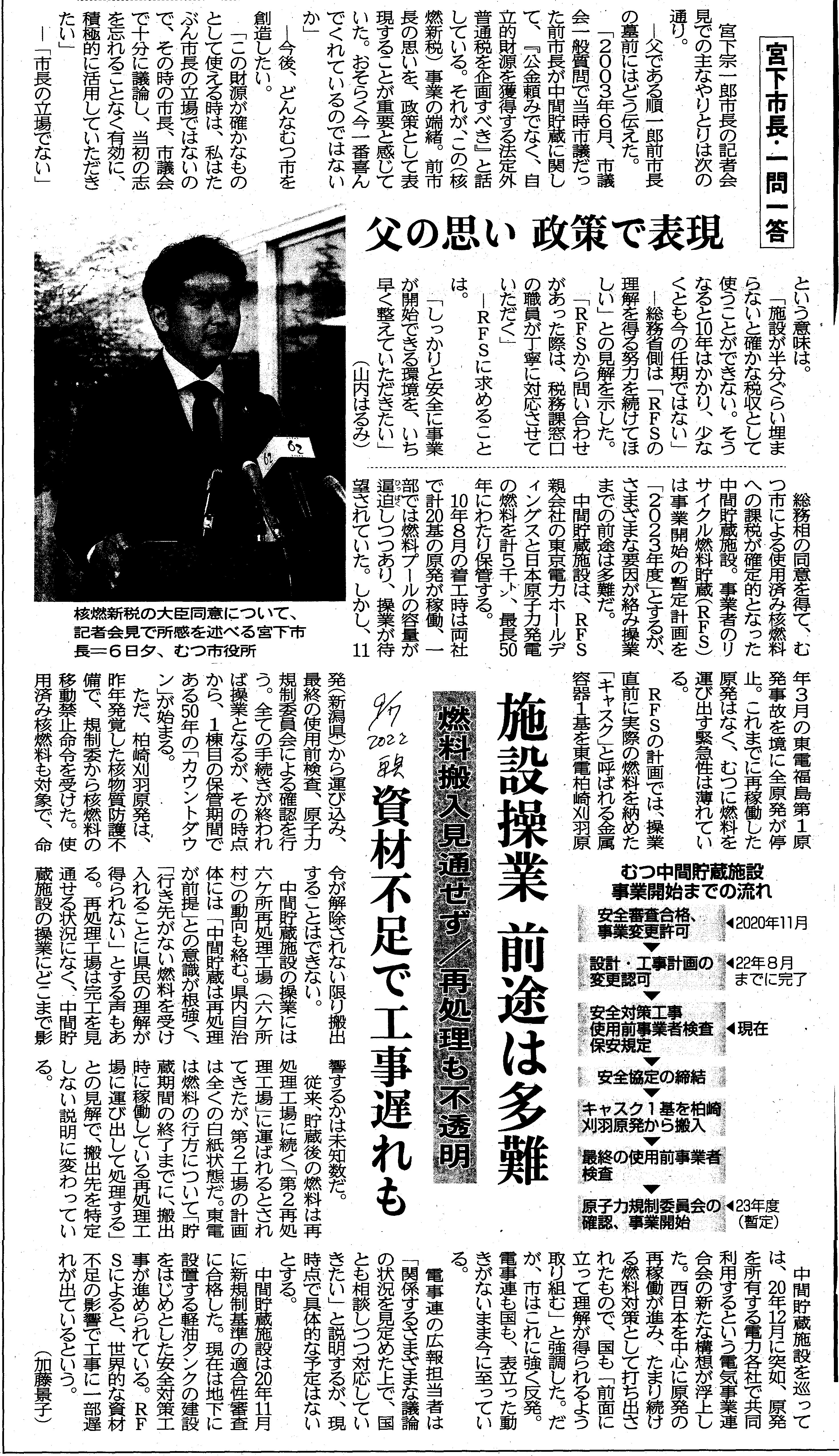 [2022_09_07_18]施設操業 前途は多難 燃料搬入見通せず/再処理も不透明 資材不足で工事遅れも 宮下市長・一問一答 父の思い 政策で表現(東奥日報2022年9月7日)