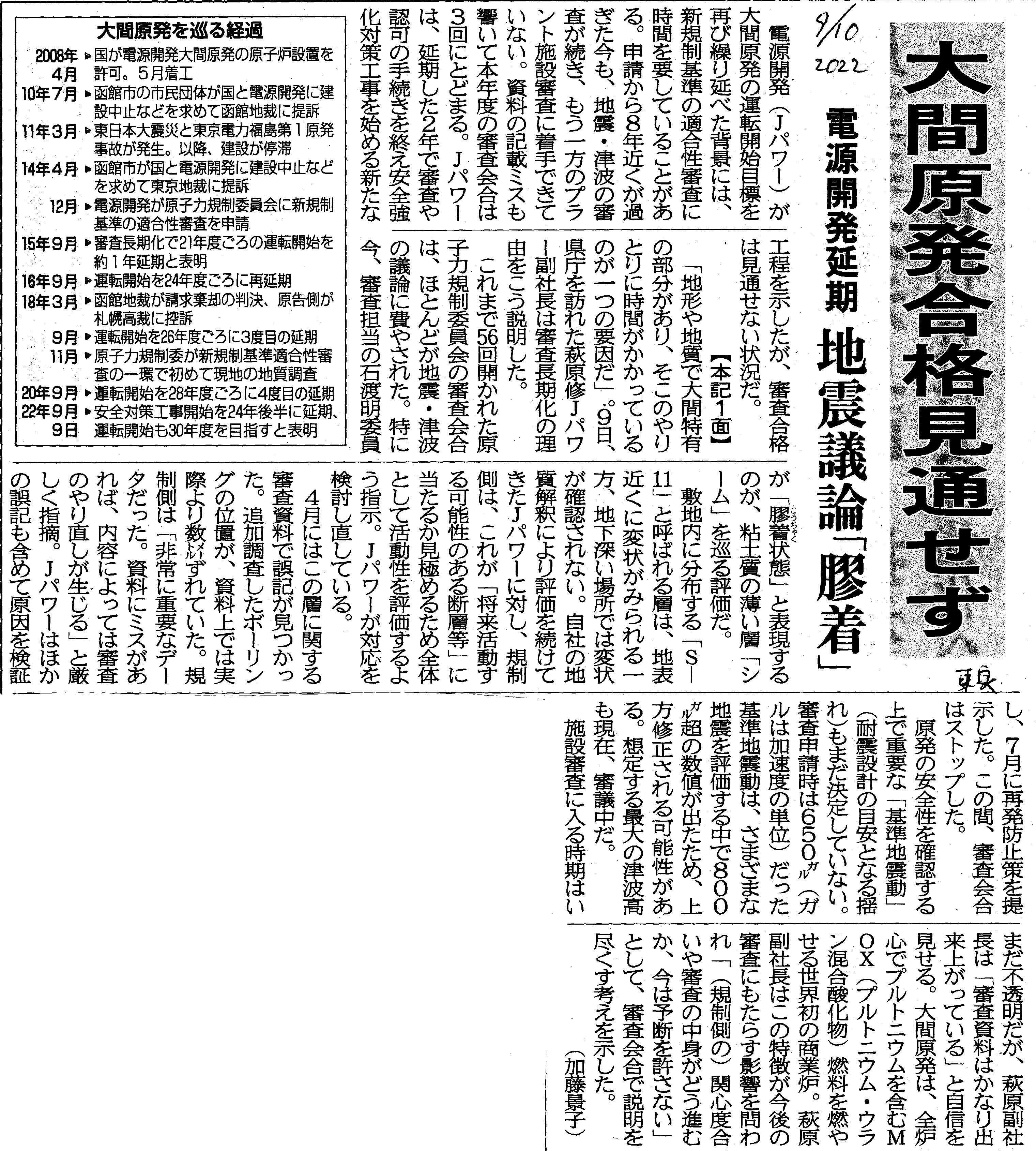 [2022_09_10_01]大間原発合格見通せず 電源開発延期 地震論議「膠着」(東奥日報2022年9月10日)