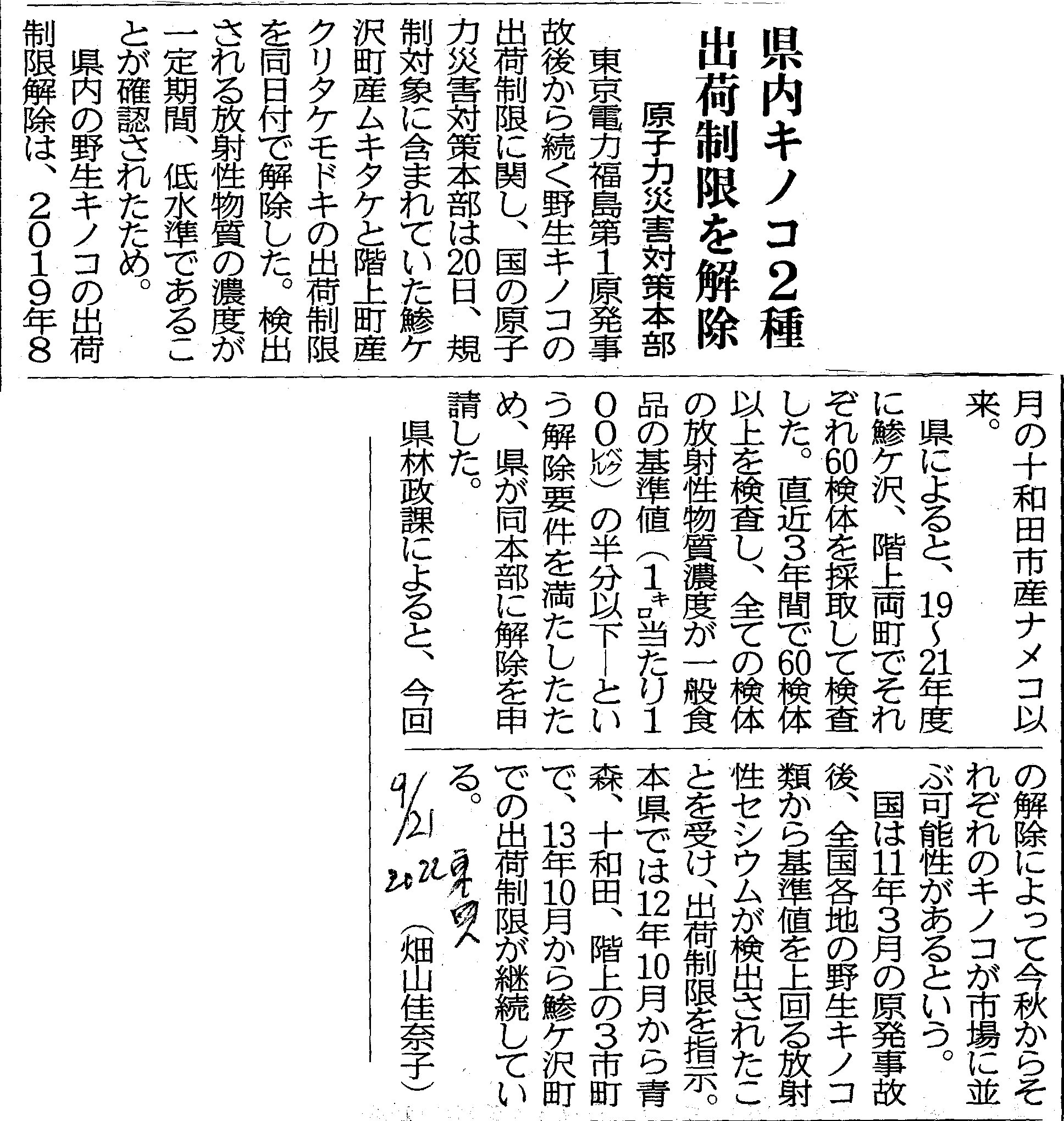 [2022_09_21_02]県内キノコ2種 出荷制限を解除 原子力災害対策本部(東奥日報2022年9月21日)