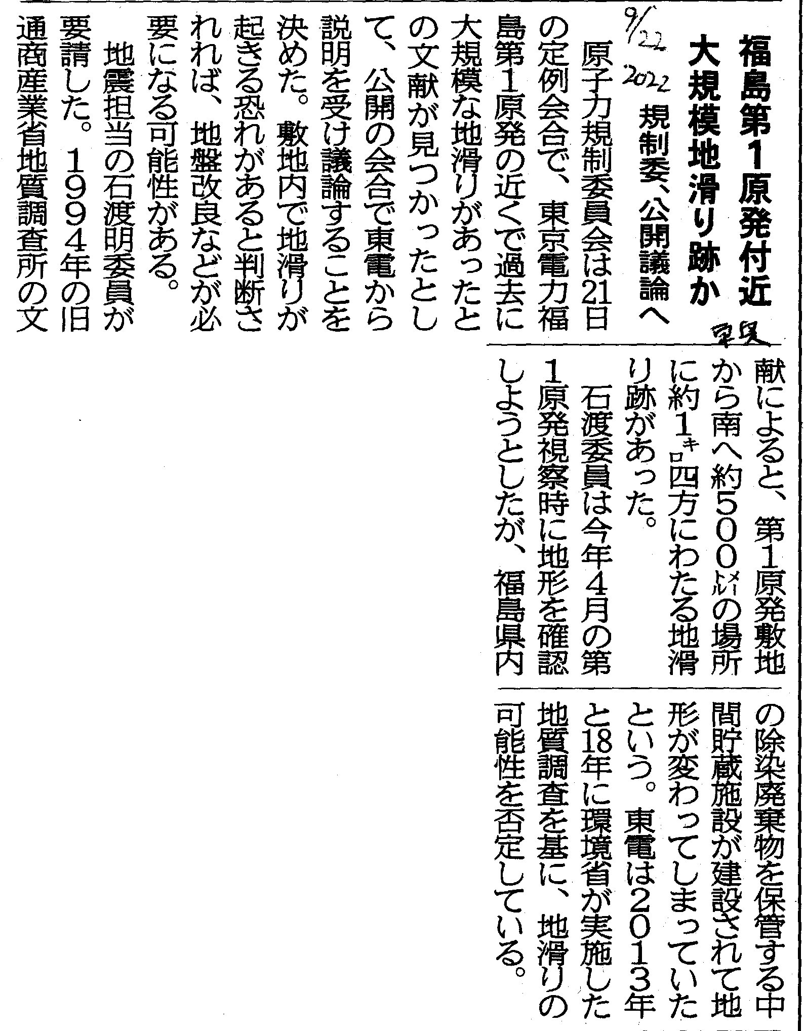 | [2022_09_22_01]福島第1原発付近 大規模地滑り跡か 規制委、公開議論へ(東奥日報2022年9月22日) |