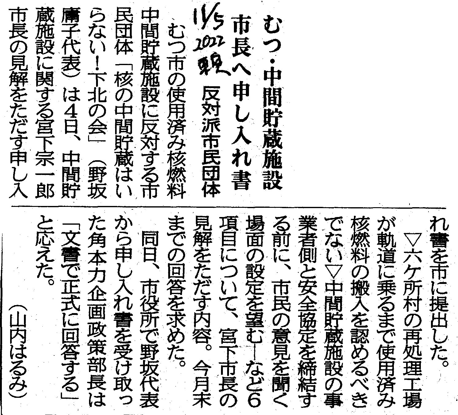 [2022_11_05_07]反対派市民団体 むつ・中間貯蔵施設 市長へ申し入れ書(東奥日報2022年11月5日)