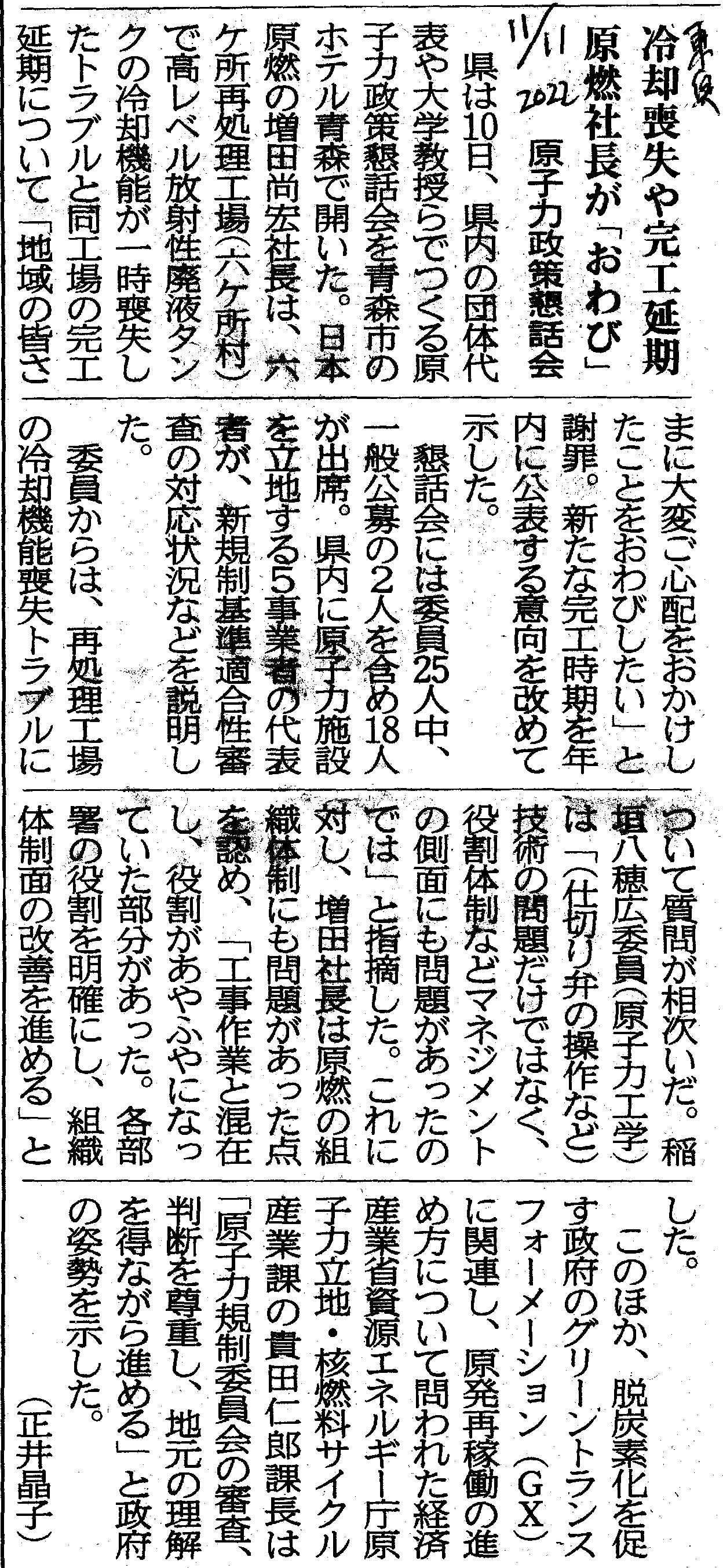[2022_11_11_02]原子力政策懇話会 冷却喪失や完工延期 原燃社長が「おわび」(東奥日報2022年11月11日)