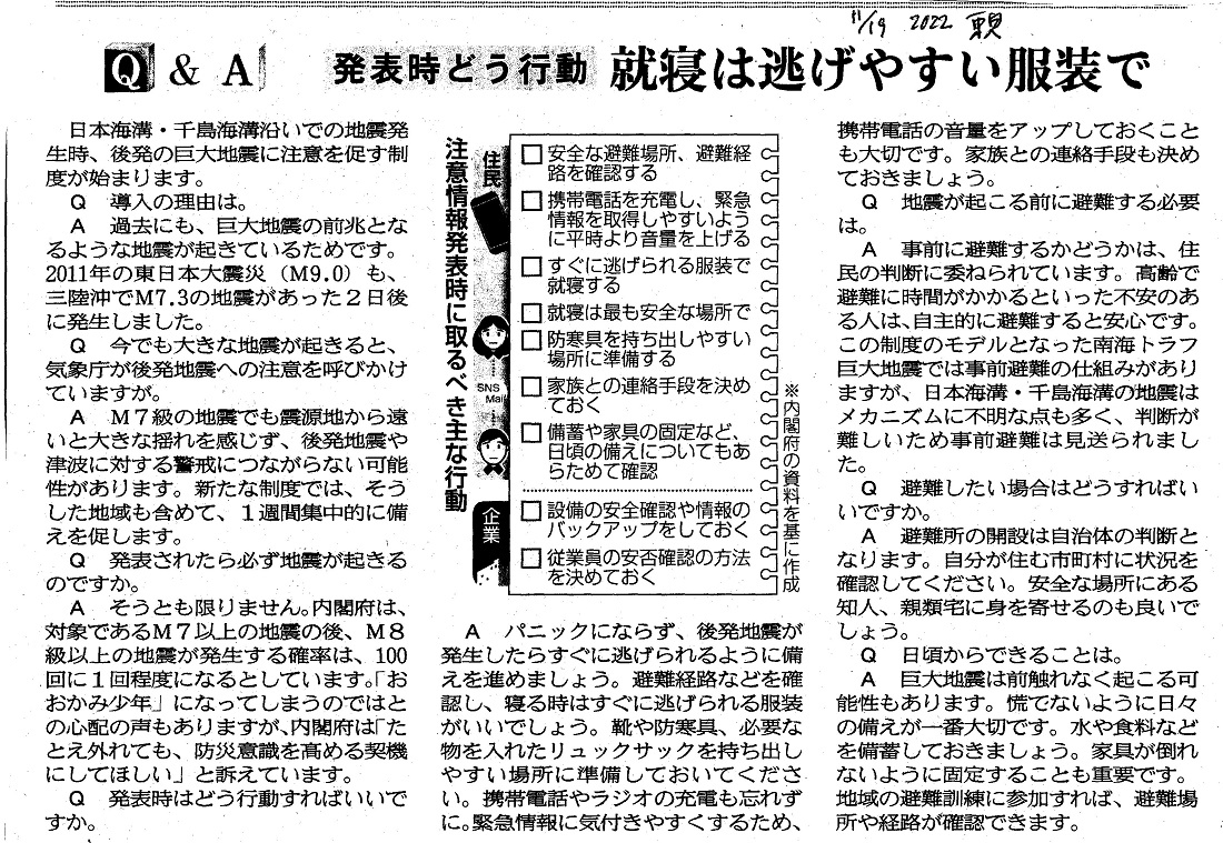 | [2022_11_19_04]Q&A 発表時どう行動 就寝は逃げやすい服装で(東奥日報2022年11月19日) |
