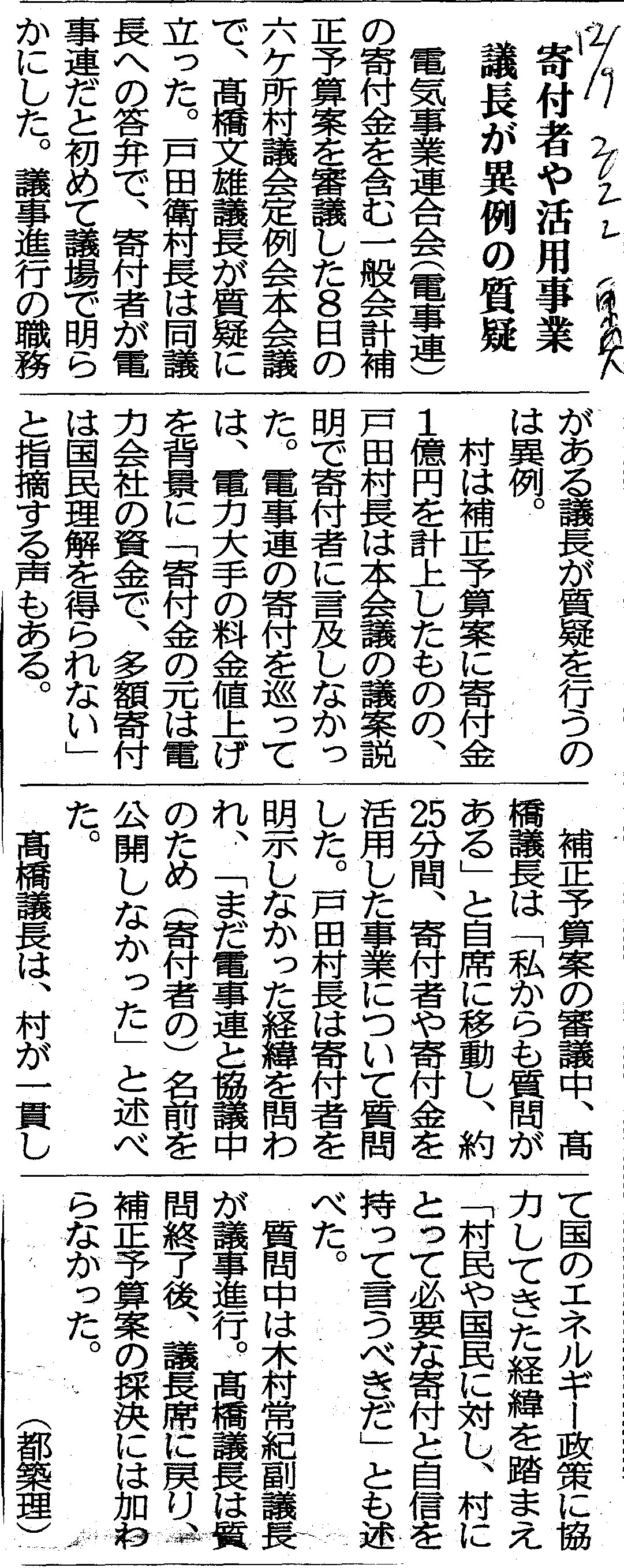 [2022_12_09_09]寄付者や活用事業 議長が異例の質疑(東奥日報2022年12月9日)