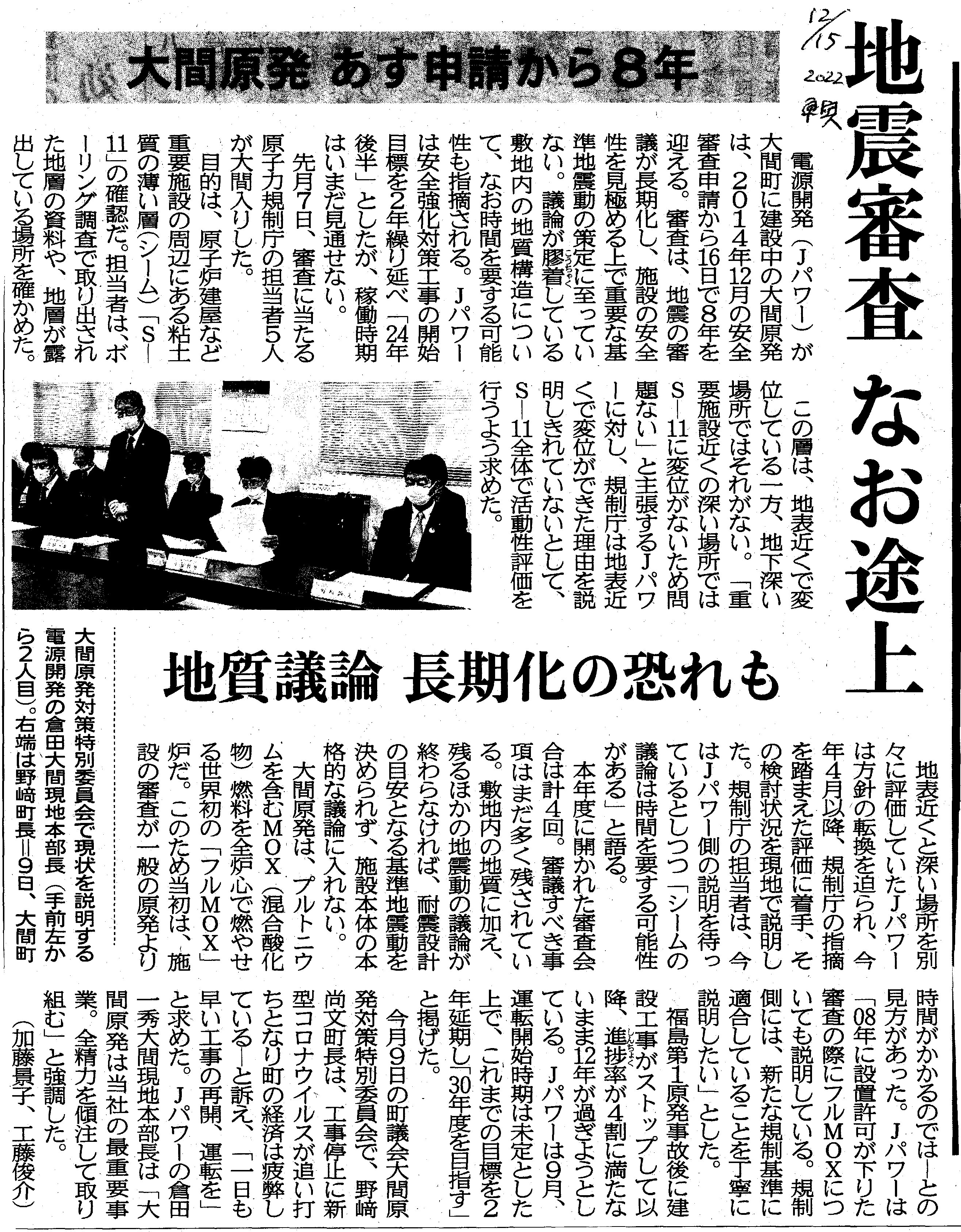 [2022_12_15_03]大間原発 あす申請から8年 地震審査 なお途上 地質議論 長期化の恐れも(東奥日報2022年12月15日)