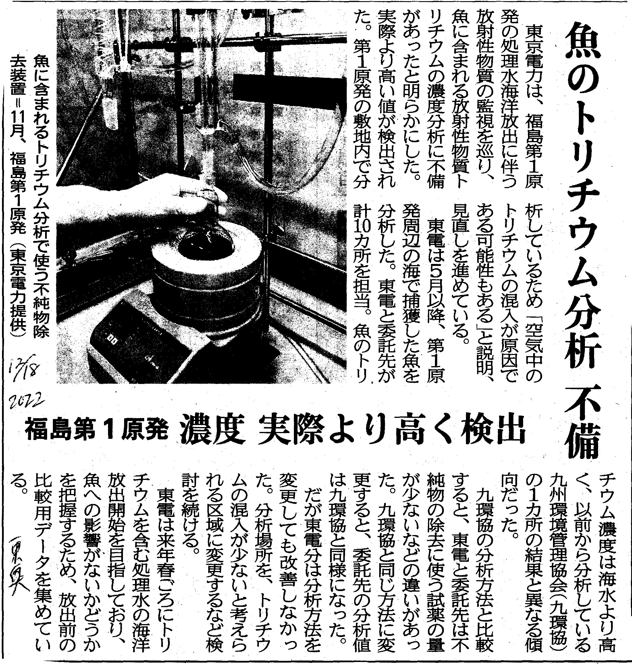 [2022_12_18_04]魚のトリチウム分析 不備 福島第1原発 濃度 実際より高く検出(東奥日報2022年12月18日)