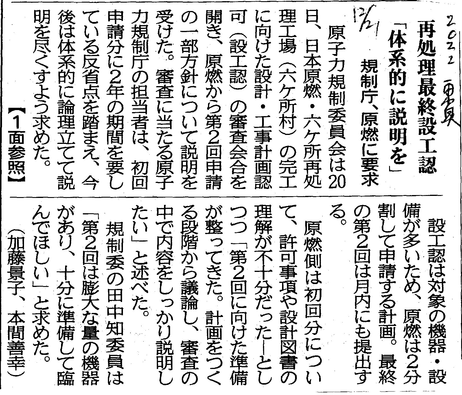 [2022_12_21_13]再処理最終設工認 「体系的に説明を」 規制庁、原燃に要求(東奥日報2022年12月21日)