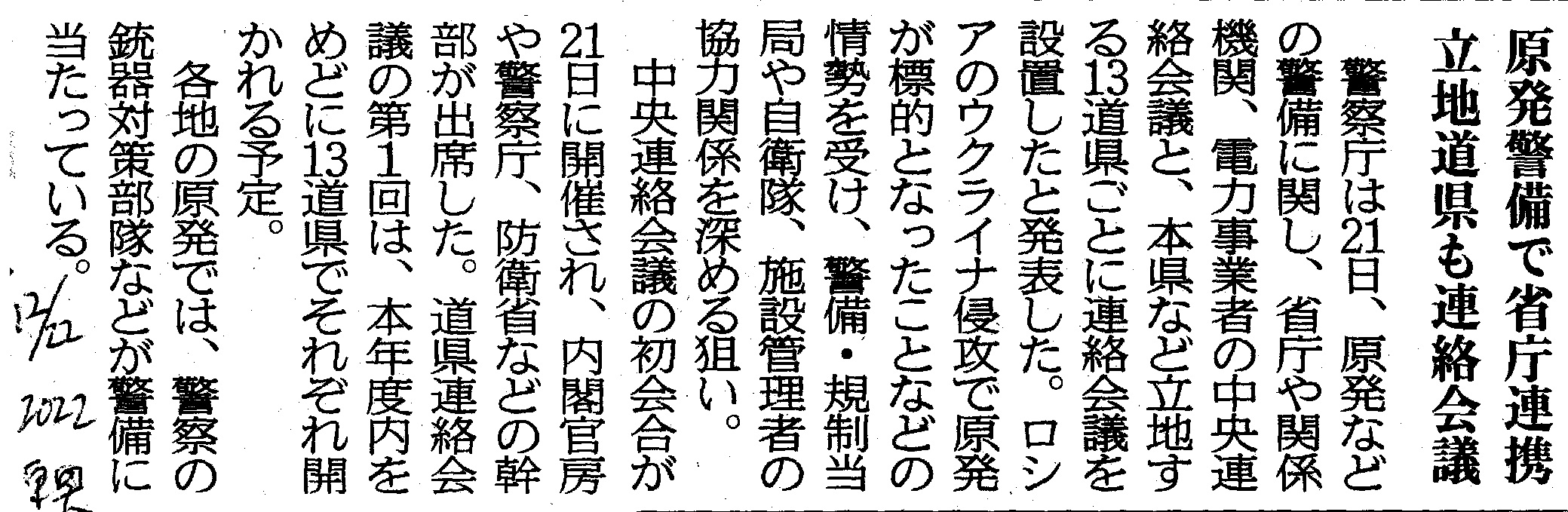 [2022_12_22_08]原発警備で省庁連携 立地道県も連絡会議(東奥日報2022年12月22日)