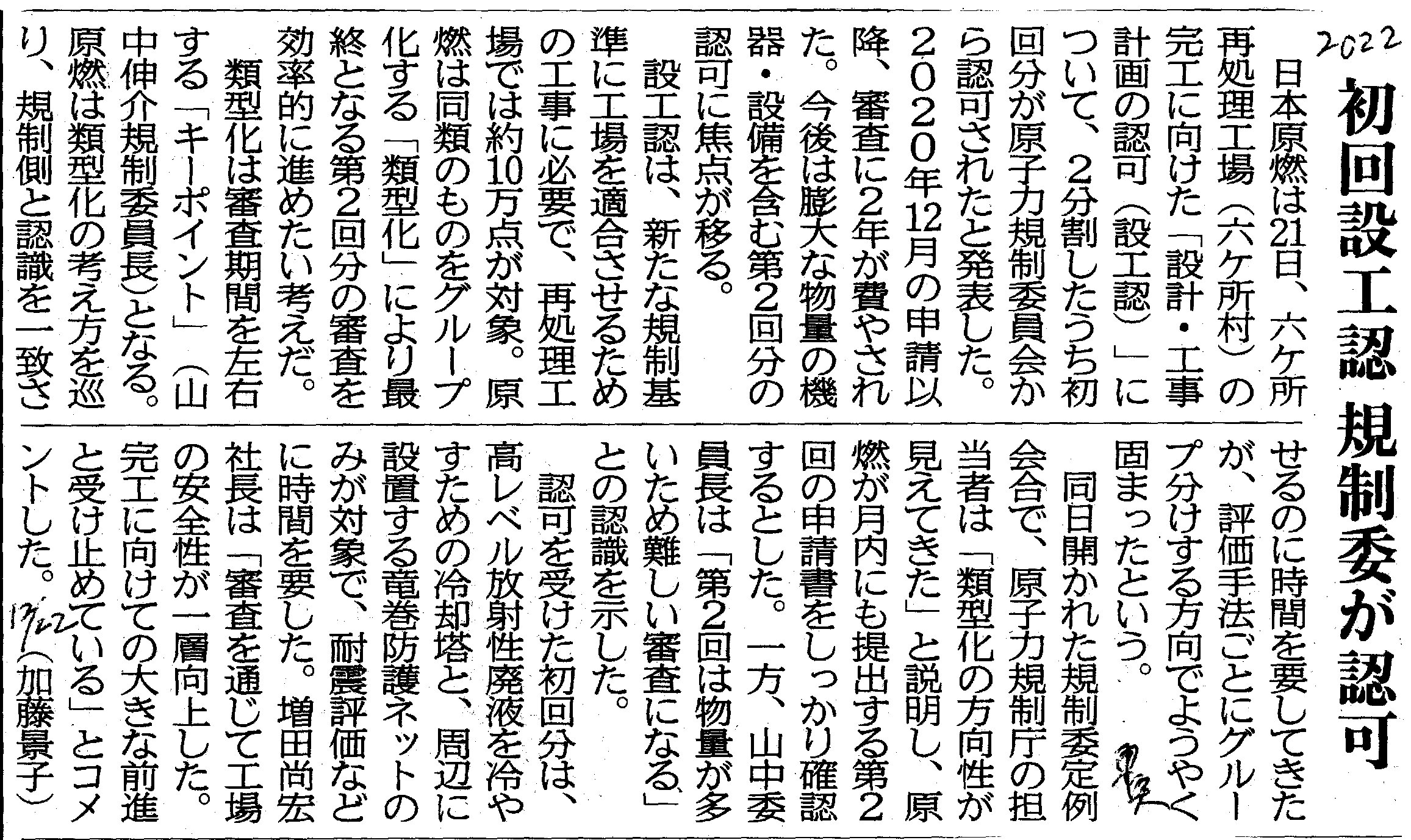 [2022_12_22_09]初回設工認 規制委が認可(東奥日報2022年12月22日)