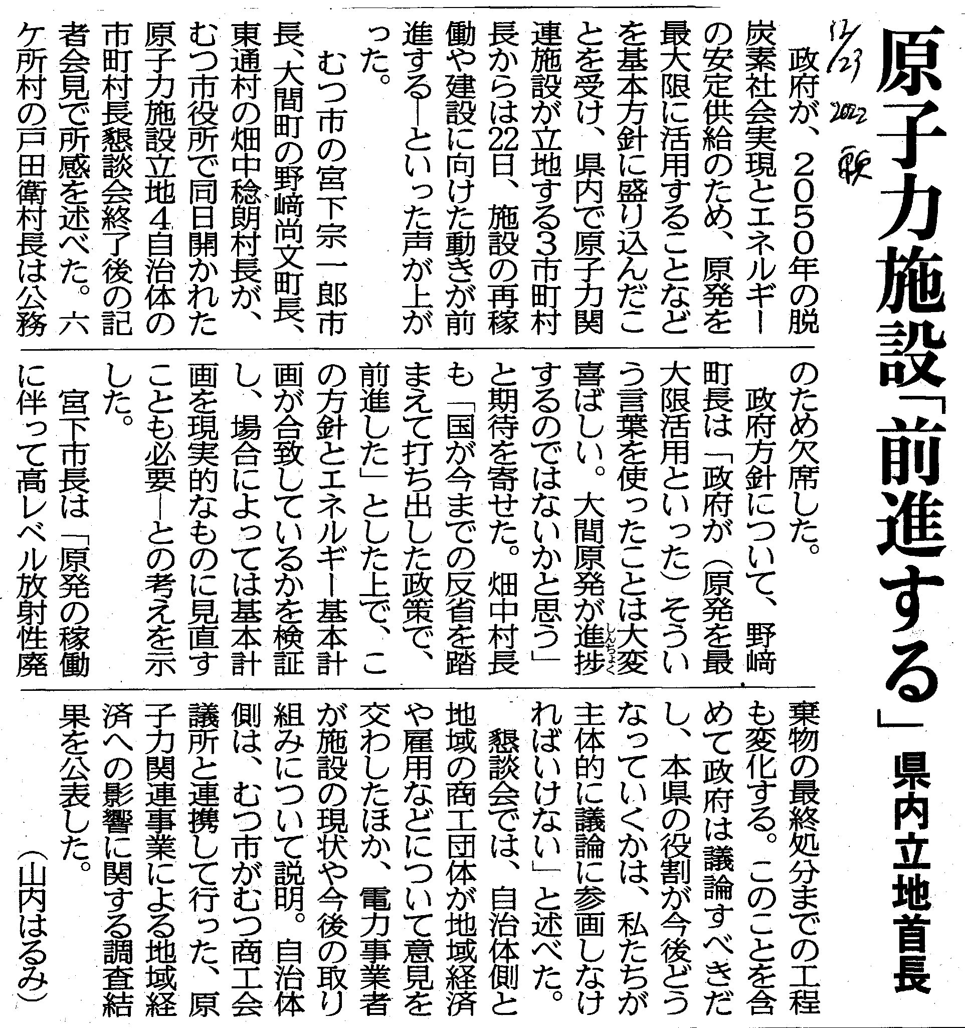 [2022_12_23_01]原子力施設「前進する」 県内立地首長(東奥日報2022年12月23日)