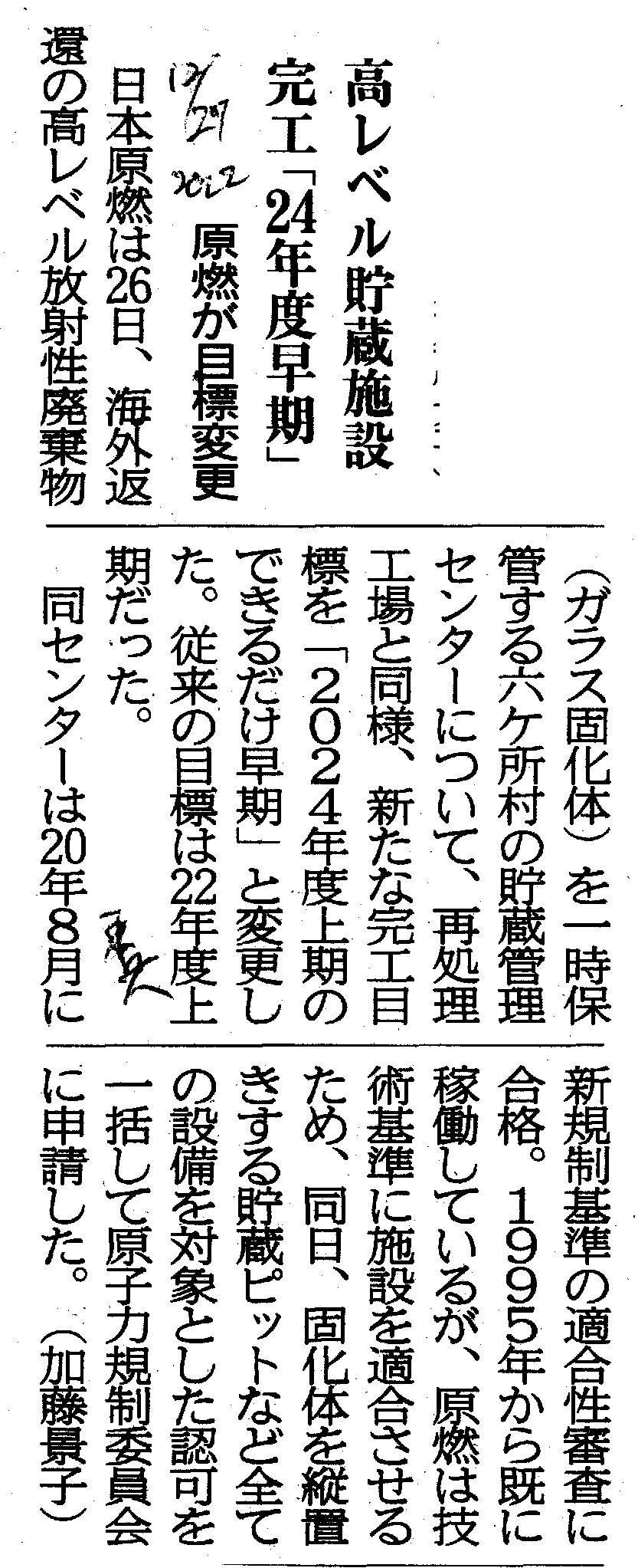 [2022_12_27_09]高レベル貯蔵施設 完工「24年度早期」 原燃が目標変更(東奥日報2022年12月27日)