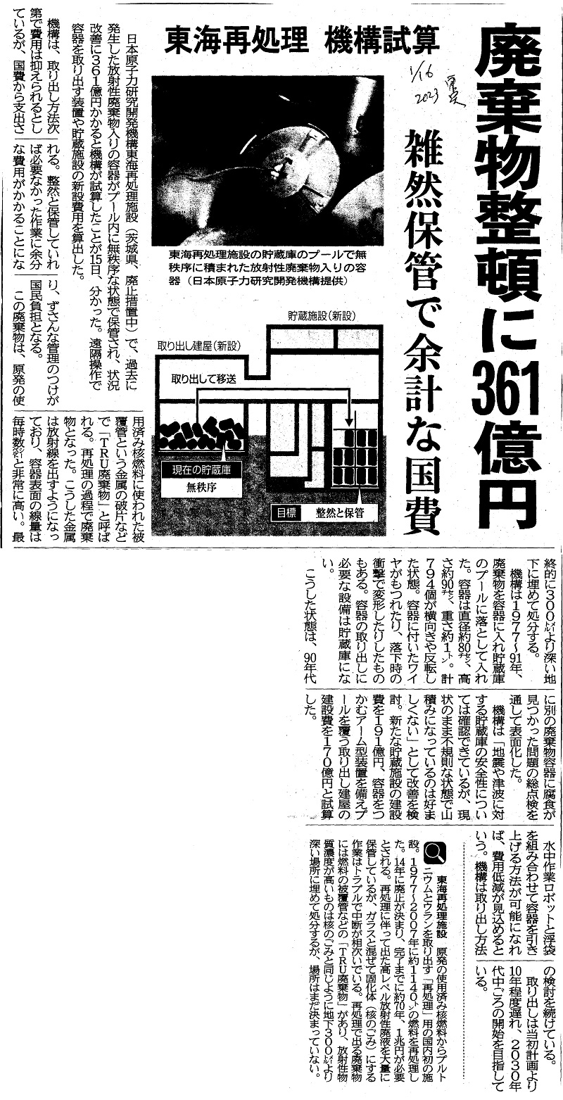 | [2023_01_16_01]東海再処理 機構試算 廃棄物整頓に361億円 雑然保管で余計な国費(東奥日報2023年1月16日) |