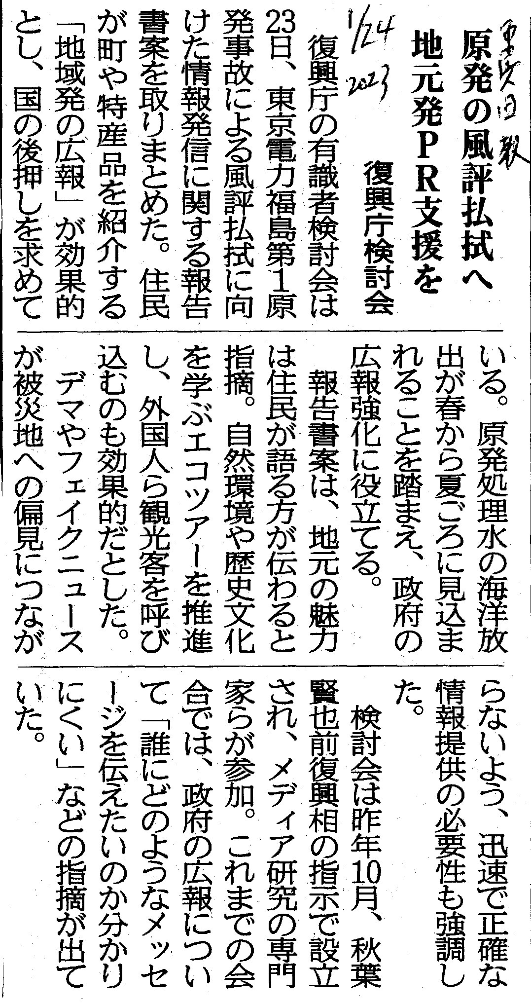 [2023_01_24_01]原発の風評払拭へ 地元発PR支援を 復興庁検討会(東奥日報2023年1月24日)