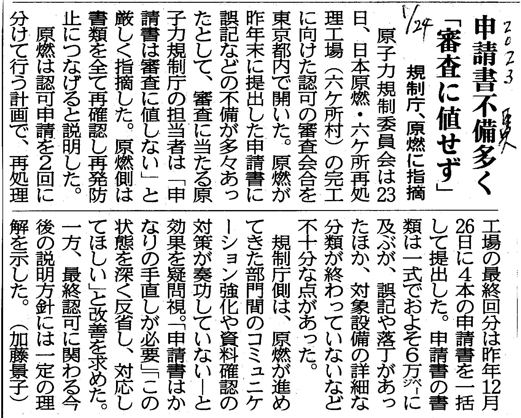 [2023_01_24_02]申請書不備多く 「審査に値せず」 規制庁、原燃に指摘(東奥日報2023年1月24日)