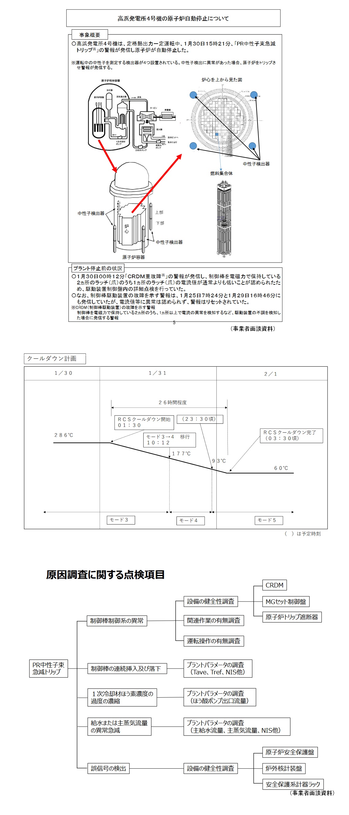 原子力施設等におけるトピックス (令和 5 年 1 月 23 日〜令和 5 年 1 月 30 日) 令 和 5 年 2 月 1 日 原 子 力 規 制 庁 〇令和 5 年 1 月 23 日〜1 月 30 日の間に発生した以下の法令報告事象に該当する事案は、下表のとおり。 ・原子炉等規制法第62条の3又は放射性同位元素等規制法第31条の2に基づく報告事案(発生に係る報告に限る) 発表日 事業者名 事業所名 件名 備考 1月30日 関西電力株式会社 高浜発電所 高浜発電所 4号機の原子炉自動停止について 〇主要な原子力事業者(*)の原子力事業所内で令和 5 年 1 月 23 日〜1 月 30 日の間に発生した以下に該当する事案は、下表のとおり。 ・保安規定に定める運転上の制限(LCO)から逸脱した事案 ・原子炉等規制法第62条の3に基づく報告事項に該当しないが安全確保に関係する事案で、事業者がプレス公表したもの *・・・・原子力発電所を所有する電気事業者、日本原子力研究開発機構及び日本原燃(株) 発表日 事業者名 事業所名 件名 備考 該当なし <参考> 海外の原子力施設におけるトピックス 該当なし <その他> 日本原燃株式会社再処理事業所構内(管理区域外)における車両からの火災の発生と鎮火の確認について (別紙 1)関西電力株式会社からの報告の概要 (別紙 2)日本原燃株式会社の公表資料 (別紙1) (中略) 関西電力(株)から高浜発電所4号機で発生した原子炉の自動停止について報告を受理 原子力規制委員会 掲載日:2023年1月30日 原子力規制委員会は、令和5年1月30日、関西電力株式会社(以下「関西電力」という。)から、定格熱出力一定運転中の高浜発電所4号機において、原子炉が自動停止したことから、核原料物質、核燃料物質及び原子炉の規制に関する法律第62条の3の規定に基づく法令報告事象に該当するとの報告を受けました。 発生報告 1.関西電力からの報告内容 令和5年1月30日、定格熱出力一定運転中の高浜発電所4号機において、PR中性子束急減トリップ(注)の警報が発信し、原子炉が自動停止したことから、核原料物質、核燃料物質及び原子炉の規制に関する法律第62条の3の規定に基づく法令報告事象として判断した旨の報告がありました。 関西電力から受けた報告の概要は別紙のとおりです。 注:出力領域中性子束急減トリップ 2.原子力規制委員会の対応 本件に係る報告を受けて、現地の原子力運転検査官が現場で環境への影響がないことを確認しています。 今後、関西電力が行う原因究明及び再発防止策について、確認していきます。 令和5年01月30日 [別紙]関西電力からの報告の概要【PDF: 53KB】 (中略) 別紙 関西電力からの報告の概要 (30日17時00分までに受けたもの) ○ 本日15時21分、定格熱出力一定運転中の高浜発電所4号機において、PR中性子束急減トリップ(※1)の警報が発信し、原子炉が自動停止した。 ○ 以上から、本日15時21分、実用炉規則第134条第2号に定める、発電用原子炉の運転中において、発電用原子炉施設の故障(※2)により、発電用原子炉の運転が停止したときに該当すると判断。 ○ 本事象による環境への影響はない。 ※1:出力領域中性子束急減トリップ ※2:「発電用原子炉施設の故障」とは、発電用原子炉施設が当該施設を構成する機器又はその部品の損傷若しくは破壊、又は当該施設を構成する機器の誤動作若しくは誤操作による異常状態にある状況をいう。 高浜発電所4号機の原子炉自動停止について 2023年1月30日 関西電力株式会社 高浜発電所4号機(加圧水型軽水炉)は、定格熱出力一定運転中、本日15時21分、「PR中性子束急減トリップ※」の警報が発信し、原子炉が自動停止しました。 原因については、現在、調査中です。 なお、環境への放射能の影響はありません。 ※ 運転中の中性子を測定する検出器が4つ設置されている。中性子検出に異常があった場合、警報が発信する。 以 上 添付資料:高浜発電所4号機の原子炉自動停止について (事業者公表資料)4 高浜発電所4号機の原子炉自動停止について 事象概要 (中略) 〇高浜発電所4号機は、定格熱出力一定運転中、1月30日15時21分、「PR中性子束急減トリップ※」の警報が発信し原子炉が自動停止した。 ※運転中の中性子を測定する検出器が4つ設置されている。中性子検出に異常があった場合、原子炉をトリップさせ警報が発信する。 〇1月30日00時12分「CRDM重故障※」の警報が発信し、制御棒を電磁力で保持している2ヵ所のラッチ(爪)のうち1ヵ所のラッチ(爪)の電流値が通常よりも低いことが認められたため、駆動装置制御盤内の詳細点検を行っていた。 〇なお、制御棒駆動装置の故障を示す警報は、1月25日7時24分と1月29日16時46分にも発信していたが、電流値等に異常は認められず、警報はリセットされていた。 ※CRDM(制御棒駆動装置)の故障を示す警報 制御棒を電磁力で保持している2ヵ所のうち、1ヵ所以上で電流の異常を検知するなど、駆動装置の不調を検知した場合に発信する警報 (事業者面談資料) クールダウン計画 (中略) 原因調査に関する点検項目 (後略) ※以下は引用者が参照元PDFから抜粋した画像です。 |