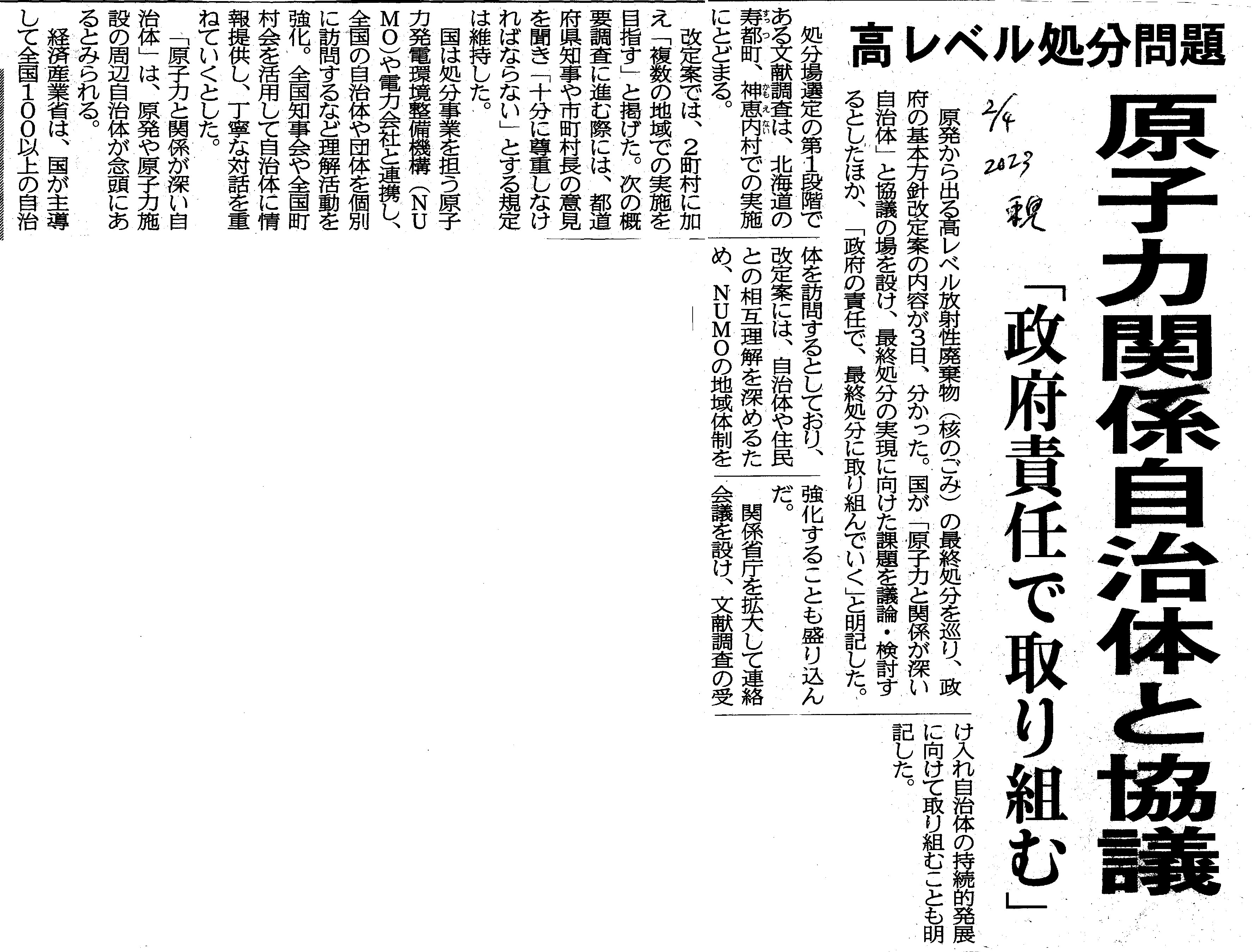 [2023_02_04_04]高レベル処分問題 原子力関係自治体と協議 「政府責任で取り組む」(東奥日報2023年2月4日)