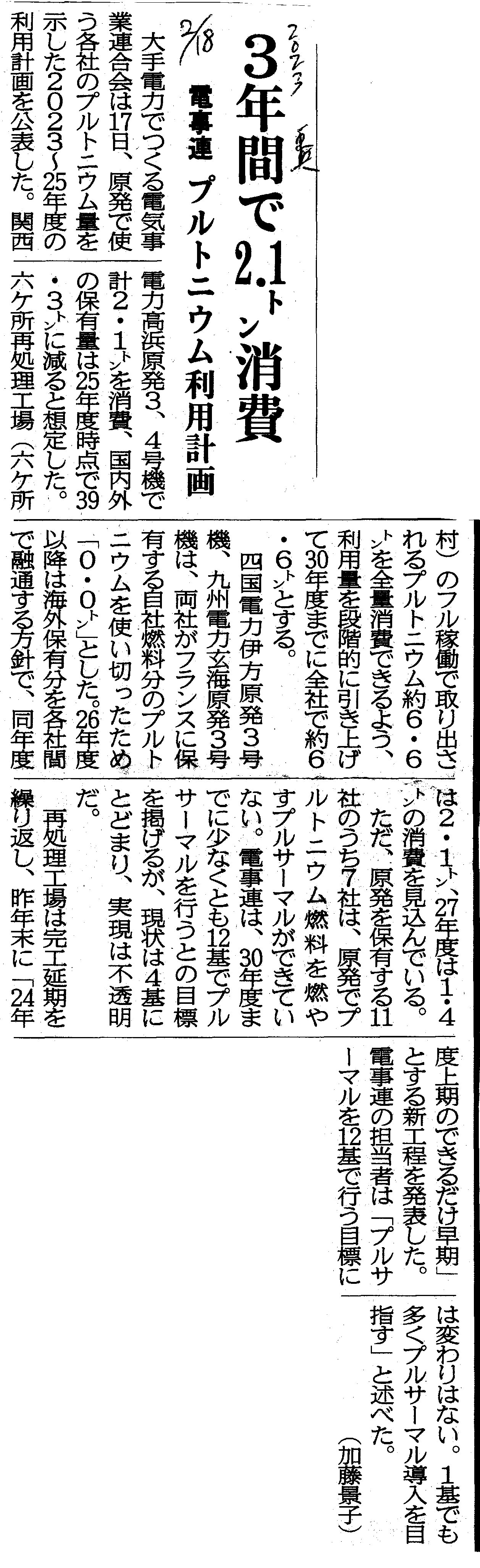 [2023_02_18_07]3年間で2.1トン消費 電事連 プルトニウム利用計画(東奥日報2023年2月18日)