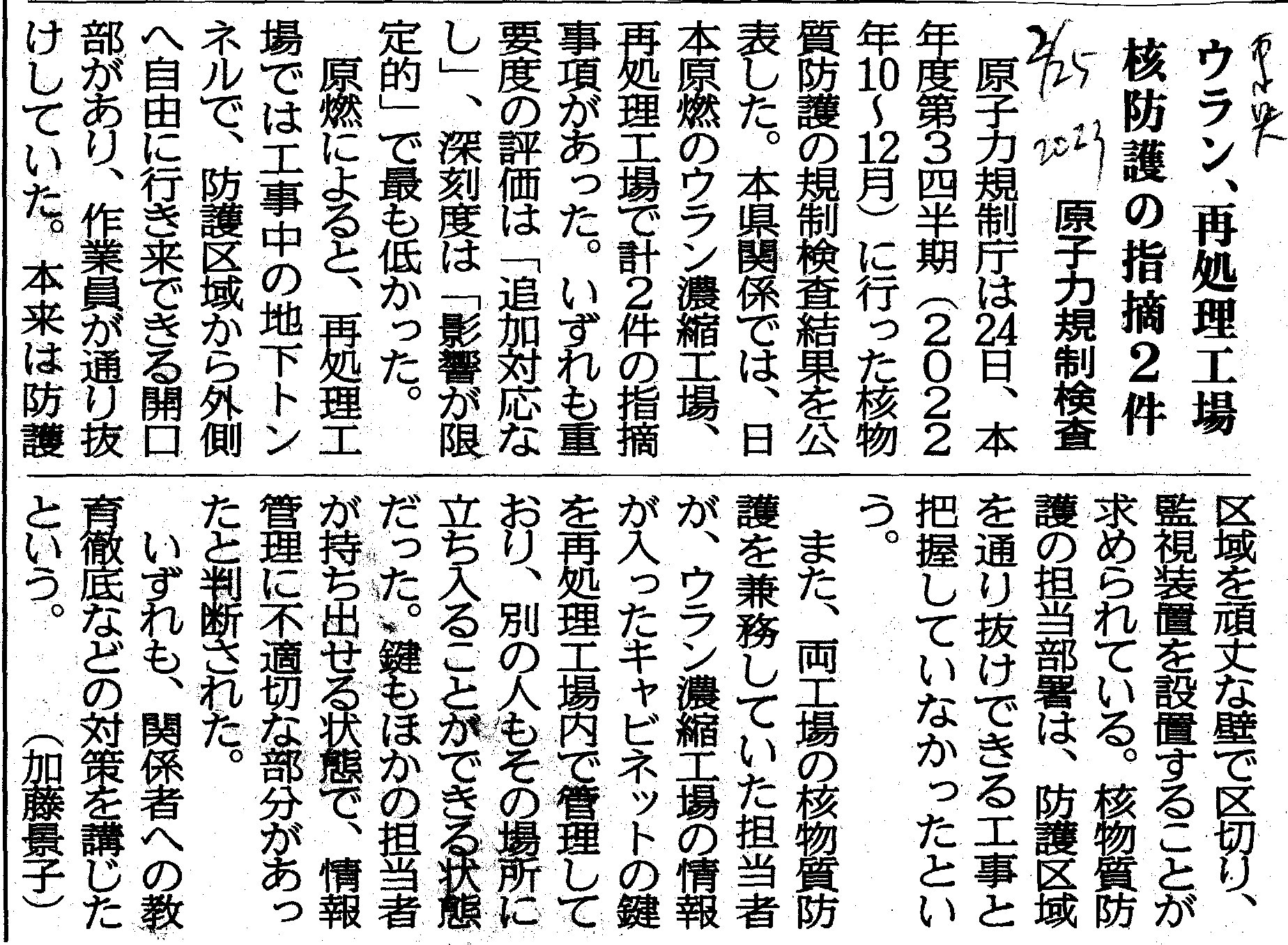 [2023_02_25_04]ウラン、再処理工場 核防護の指摘2件 原子力規制検査(東奥日報2023年2月25日)