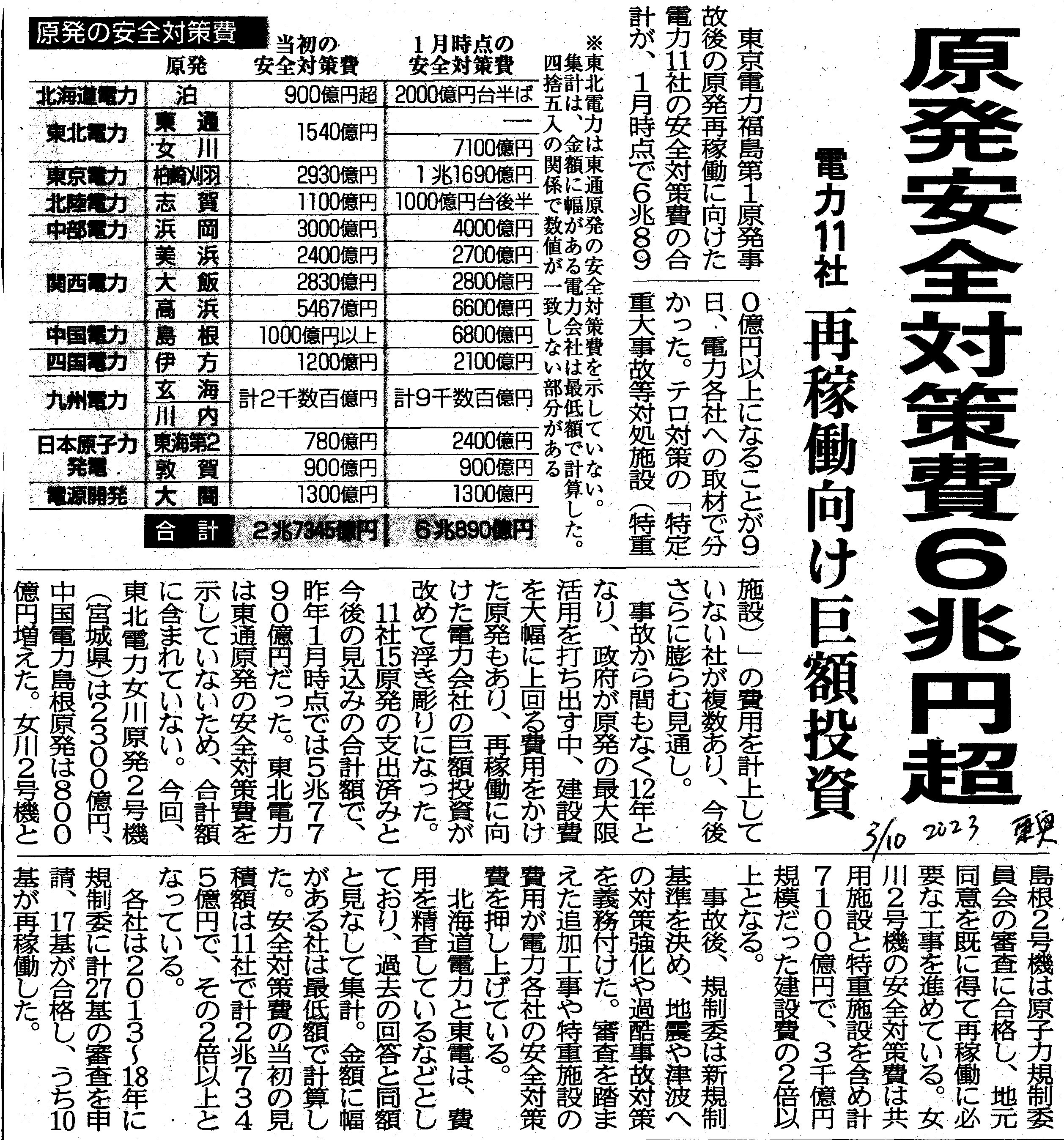 [2023_03_10_07]原発安全対策費6兆円 電力11社 再稼働向け巨額投資(東奥日報2023年3月10日)