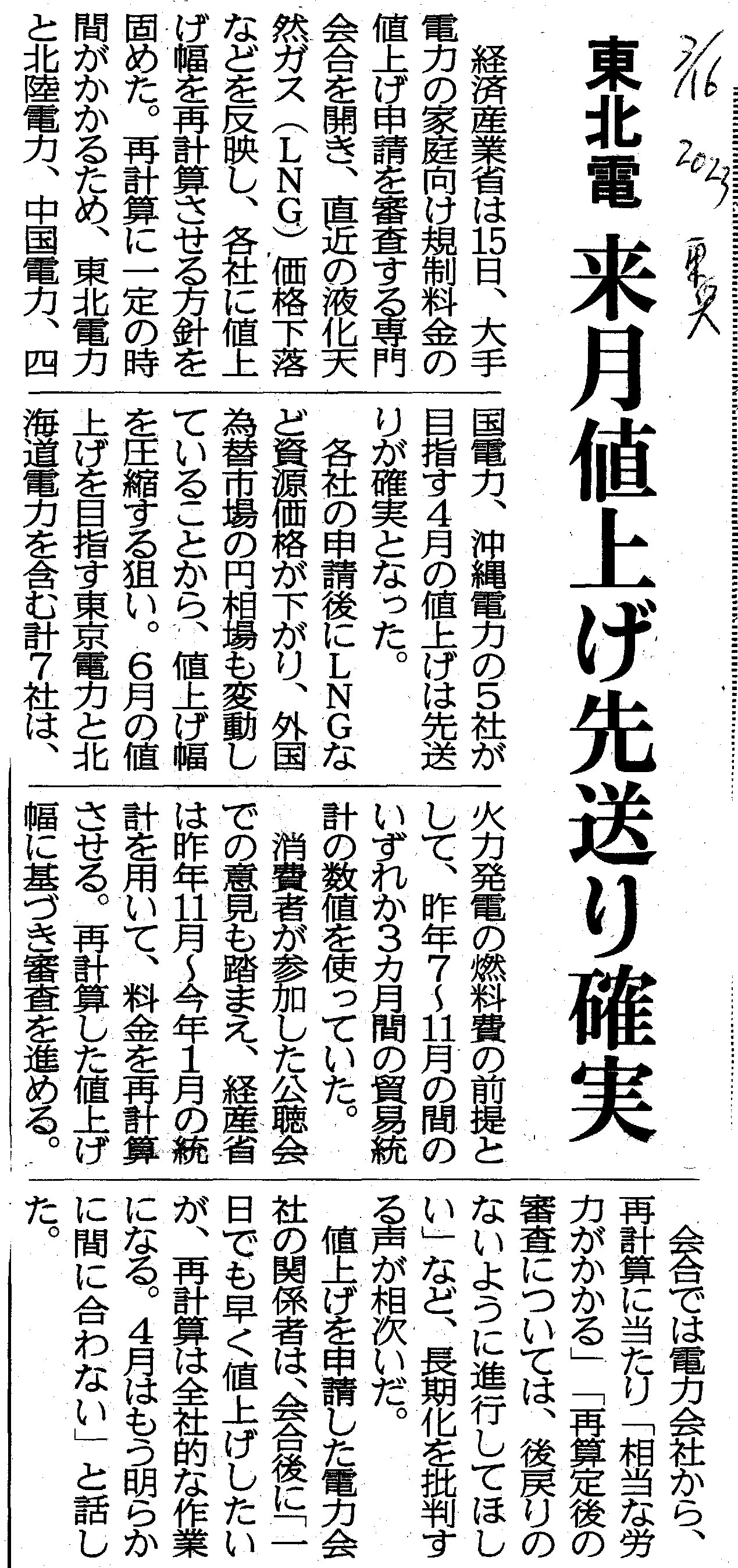 [2023_03_16_01]東北電 来月値上げ先送り確実(東奥日報2023年3月16日)