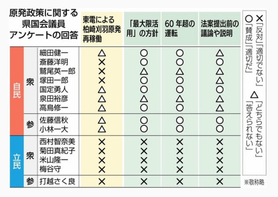 原発の「最大限活用」を掲げる政府が今夏以降に新潟県の東京電力柏崎刈羽原発6、7号機の再稼働を目指していることを受け、新潟日報社は4月12日までに新潟県関係の国会議員全14人を対象に原発政策に関するアンケートを行った。アンケートでは、「原発政策に関する政府の方針転換」「60年を超える原発の運転を可能にする法改正案」の賛否も尋ねた=表参照=。いずれの質問も自民党議員は大半が「賛成」を選んだが、一部は... (後略) |