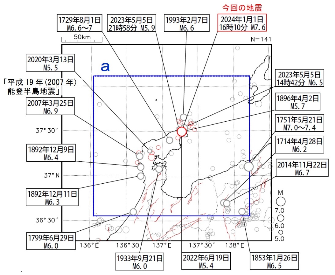 1700年以降の活動をみると、今回の地震の震央周辺(領域a)では、M5.0以上の地震が時々発生している。2007年3月25日には「平成19年(2007年)能登半島地震」が発生し、石川県珠洲市で22cmの津波を観測した。領域a内の地震により新潟県、富山県、石川県及び福井県で生じた主な被害を下の表に示す。
