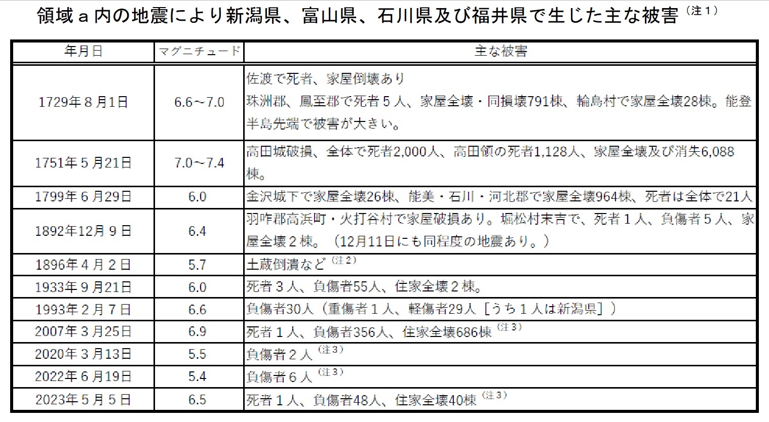 領域a内の地震により新潟県、富山県、石川県及び福井県で生じた主な被害(注1)