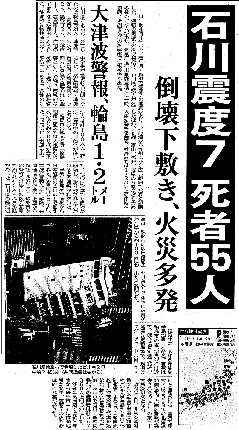 | [2024_01_03_04]石川震度7 死者55人 倒壊下敷き、火災多発 大津波警報、輪島1.2メートル(東奥日報2024年1月3日) |