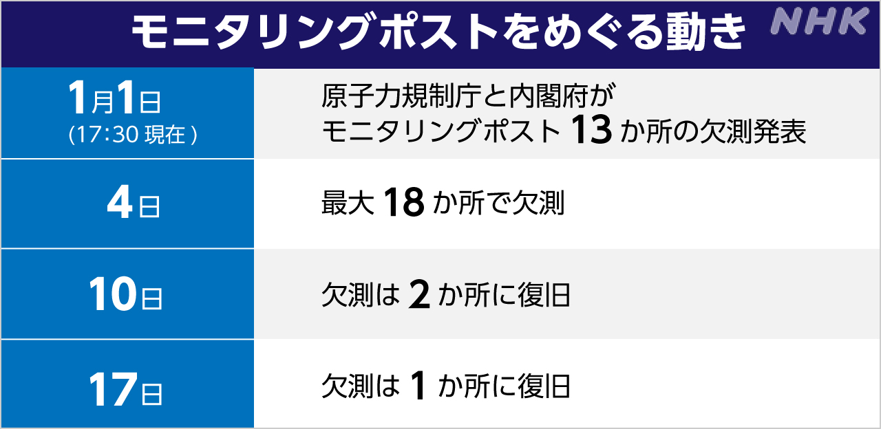 20:22 震度7を観測した石川県志賀町にある志賀原子力発電所。 北陸電力は安全上重要な設備の電源は確保されているとしていますが、電源などの設備にトラブルが相次ぐ事態に。さらに、火災の発生や津波の情報をめぐり、訂正が繰り返されました。 志賀原発でいったい何が起きていたのでしょうか? 現場で何が起きていたのか 志賀原発の1号機や2号機では何が起きていたのか。北陸電力の対応などとともに、時系列でまとめました。 今回の地震で課題となったのが緊急時の情報発信です。 北陸電力の情報発信 地震が発生した当初、北陸電力は変圧器が壊れた際に消火設備が作動したことや「爆発したような音と焦げ臭い匂いがあった」とする情報を原子力規制庁に報告しました。 これを受けて、林官房長官は緊急の記者会見のなかで「志賀原子力発電所では、変圧器の火災が発生したが、消火済みでありプラントに影響はない」などと述べました。(1日19:00〜) しかし、北陸電力はその後、現場調査をした結果として、「火災はなかった」と発表しました。 また2号機の変圧器が壊れたことで漏れ出た油の量についても、北陸電力は当初、およそ3500リットルと発表していましたが、その後、5倍以上のおよそ1万9800リットルだったと訂正しました。 油漏れは1号機の変圧器でも 津波についても、北陸電力は1月2日に開いた記者会見で、「水位を監視していたものの、有意な変化は確認されなかった」と発表していました。(2日11:00) しかし、その日の夜になって、敷地内に設置していた水位計で3メートルの水位上昇が確認されていたと訂正しました。(2日 21:00) 北陸電力は、社内で適切な情報連携がとれていなかったことが原因だったとしています。 訂正が繰り返される状況に原子力規制委員会の山中伸介委員長は1月10日の会見で、「緊急時の情報発信は難しいところがあるが、情報共有のあり方は福島第一原発事故の大きな教訓だ。今回の対応には不十分な部分もあり、まだまだ努力してほしい」と述べ、北陸電力に改善を求めています。 志賀原発 完全な復旧には半年以上かかる見通し トラブル続く 志賀原発 再稼働を申請 審査中 志賀原子力発電所は2基の原子炉があり、 ▽1号機が1993年7月に ▽2号機が2006年3月に それぞれ運転を開始しました。 事故を起こした東京電力福島第一原発と同じ沸騰水型と呼ばれるタイプで、出力は▽1号機が54万キロワット、▽2号機が135万8000キロワットとなっています。 いずれも原発事故があった2011年に運転を停止し、その後、新たにつくられた規制基準への対応が求められたことから、現在も停止したままです。 地震後に確認された原発敷地内の段差 このうち2号機は2014年に再稼働の前提となる審査を申請しましたが、敷地内の断層が将来動くかどうかの評価に時間がかかったことなどから審査は長期化していました。 原子炉内に核燃料はありませんが、燃料プールには▽1号機に672体、▽2号機に200体の使用済み核燃料が貯蔵され、冷却されています。 今回の地震では、志賀原発をめぐって、「モニタリングポスト」「避難」にも課題が指摘されています。 モニタリングポスト 一部でデータ得られず 今回の地震では、志賀原発から放射性物質が放出されるような事故には至りませんでしたが、原発周辺に設置されている放射線量を測定するモニタリングポストは、通信が途絶えた影響で一部でデータが得られなくなりました。 モニタリングポストをめぐる動き 石川県と富山県ではあわせて116か所にモニタリングポストが設置されていましたが、1月1日の地震発生直後には13か所、4日には最大18か所でデータが得られなくなりました。 モニタリングポスト(4日時点) いずれも志賀原発から半径15キロから30キロの範囲にあり、このうち石川県内の17か所は原発の北側に位置する輪島市と穴水町に集中していて、この地域一帯で観測できない状態になりました。 モニタリングポストが設置された道路が通れない様子 原子力規制庁によりますと、通信が途絶えた影響でデータを送れなくなったことが主な原因だということで、その後、通信環境の回復や替わりの装置の設置などによって復旧が進み、現時点でデータが得られないのは土砂崩れで近づけない1か所のみになっているということです。 原子力規制庁は、今後、さらに原因究明を進めて対策を検討するとしています。 可搬型のモニタリングポストを確認している様子 国の原子力災害対策指針では、モニタリングポストで測定された放射線量に応じて、避難などを判断することが定められていますが、2018年の北海道胆振東部地震でも泊原発周辺のモニタリングポストでデータの欠測が相次ぎ、各自治体が通信回線を多重化するなどの対策を取っていたところでした。 環境中の放射能の解析に詳しい名古屋大学大学院の山澤弘実教授は、「原子力災害は、今回のような地震や津波が引き金になって複合災害として生じる可能性が高く、道路の寸断や通信の途
