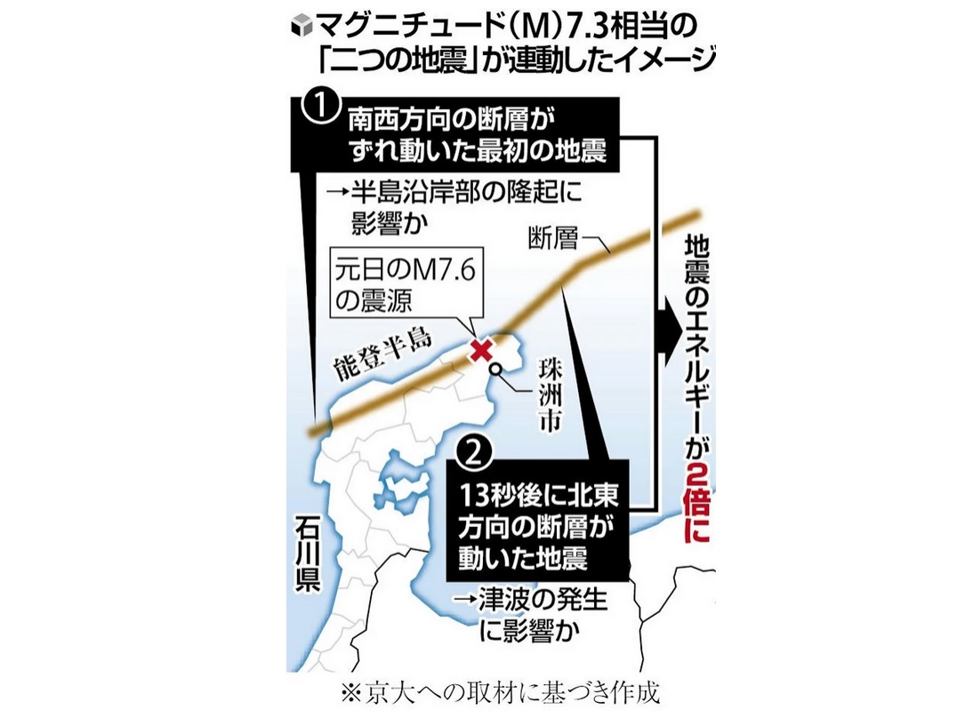 元日に起きたマグニチュード(M)7・6の能登半島地震は、M7・3相当の二つの地震が震源域近くでわずか13秒差で発生した可能性があることが、京都大防災研究所の解析でわかった。1回の地震と比べ、地震のエネルギーは約2倍に増大したと推計される。最初の揺れが収まる前に2回目の地震が起き、1分程度の激しい揺れとなって甚大な被害につながったとみられる。