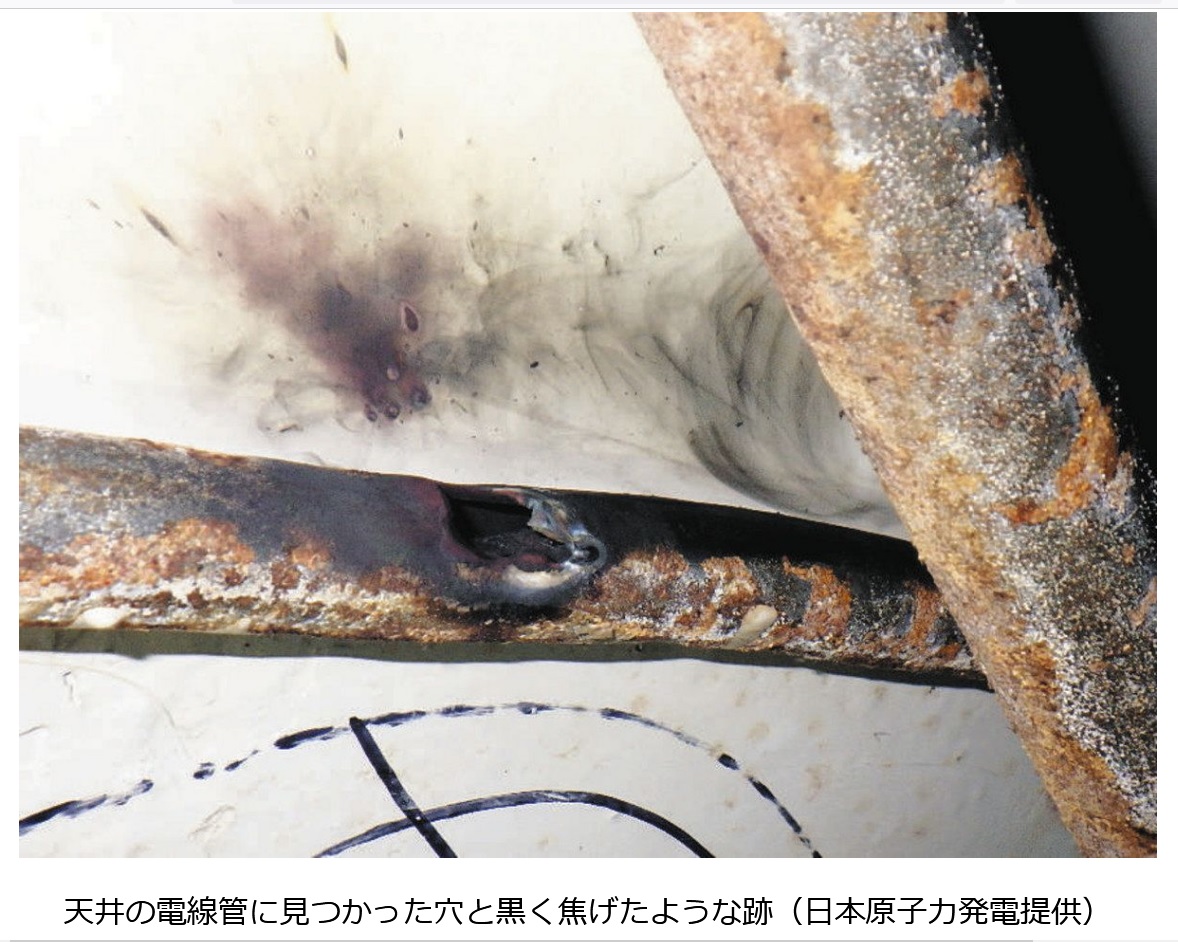 08:06 日本原子力発電は2日、東海第2原発(茨城県東海村)の管理区域内にある原子炉建屋2階のポンプ室で、天井の電線管付近から火花が飛んだと発表した。東海第2は運転停止中で、原電は施設への影響や放射性物質の漏えいなどはないとしている。 原電によると、同日午前10時5分ごろ、冷却水を浄化するためのポンプ室で社員らが照明スイッチを入れたところ、電線管付近で火花が飛んだのを確認。電線管に約2センチの楕円(だえん)形の穴と、天井に黒く焦げたような跡が見つかった。 原電によると、電線管は建屋が建設された1978年から使われており、照明の蛍光灯は2020年に交換した。電線管内部の電線の交換時期は調査中。原電は消防に連絡し、火災に当たるかや原因を調べている。 東海第2では23年度中に火災が4件発生。特に昨年10月下旬から11月上旬に3件が立て続けに発生し、県と東海村がそれぞれ原電に文書で厳重注意した。 東海第2の金居田秀二副所長は2日に記者会見し「関係者の皆さま、地元の皆さまにご迷惑、ご心配をおかけしたことを深くおわび申しあげます」と陳謝した。(竹島勇) |