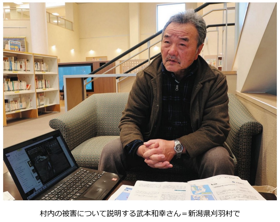 「海岸部を中心に液状化の被害が多数報告されている」。村議の武本和幸さん(74)は、数日前に村内で撮影した写真を見せながら説明する。「昨年、整備したばかりの村道も地盤が液状化してアスファルトの路面がひび割れている」