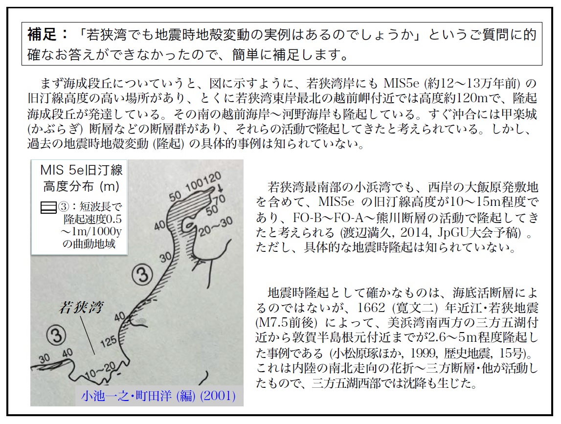 04:44 補足:「若狭湾でも地震時地殻変動の実例はあるのでしょうか」というご質問に的確なお答えができなかったので、簡単に補足します。 まず海成段丘についていうと、図に示すように、若狭湾岸にも MIS5e (約12〜13万年前) の旧汀線高度の高い場所があり、とくに若狭湾東岸最北の越前岬付近では高度約120mで、隆起海成段丘が発達している。その南の越前海岸〜河野海岸も隆起している。すぐ沖合には甲楽城(かぶらぎ) 断層などの断層群があり、それらの活動で隆起してきたと考えられている。しかし、過去の地震時地殻変動 (隆起) の具体的事例は知られていない。 若狭湾最南部の小浜湾でも、西岸の大飯原発敷地を含めて、MIS5e の旧汀線高度が10〜15m程度であり、FO-B〜FO-A〜熊川断層の活動で隆起してきたと考えられる (渡辺満久, 2014, JpGU大会予稿) 。ただし、具体的な地震時隆起は知られていない。 地震時隆起として確かなものは、海底活断層によるのではないが、1662 (寛文二) 年近江・若狭地震(M7.5前後) によって、美浜湾南西方の三方五湖付近から敦賀半島根元付近までが2.6〜5m程度隆起した事例である (小松原琢ほか, 1999, 歴史地震, 15号)。これは内陸の南北走向の花折〜三方断層・他が活動したもので、三方五湖西部では沈降も生じた。 ![]() |