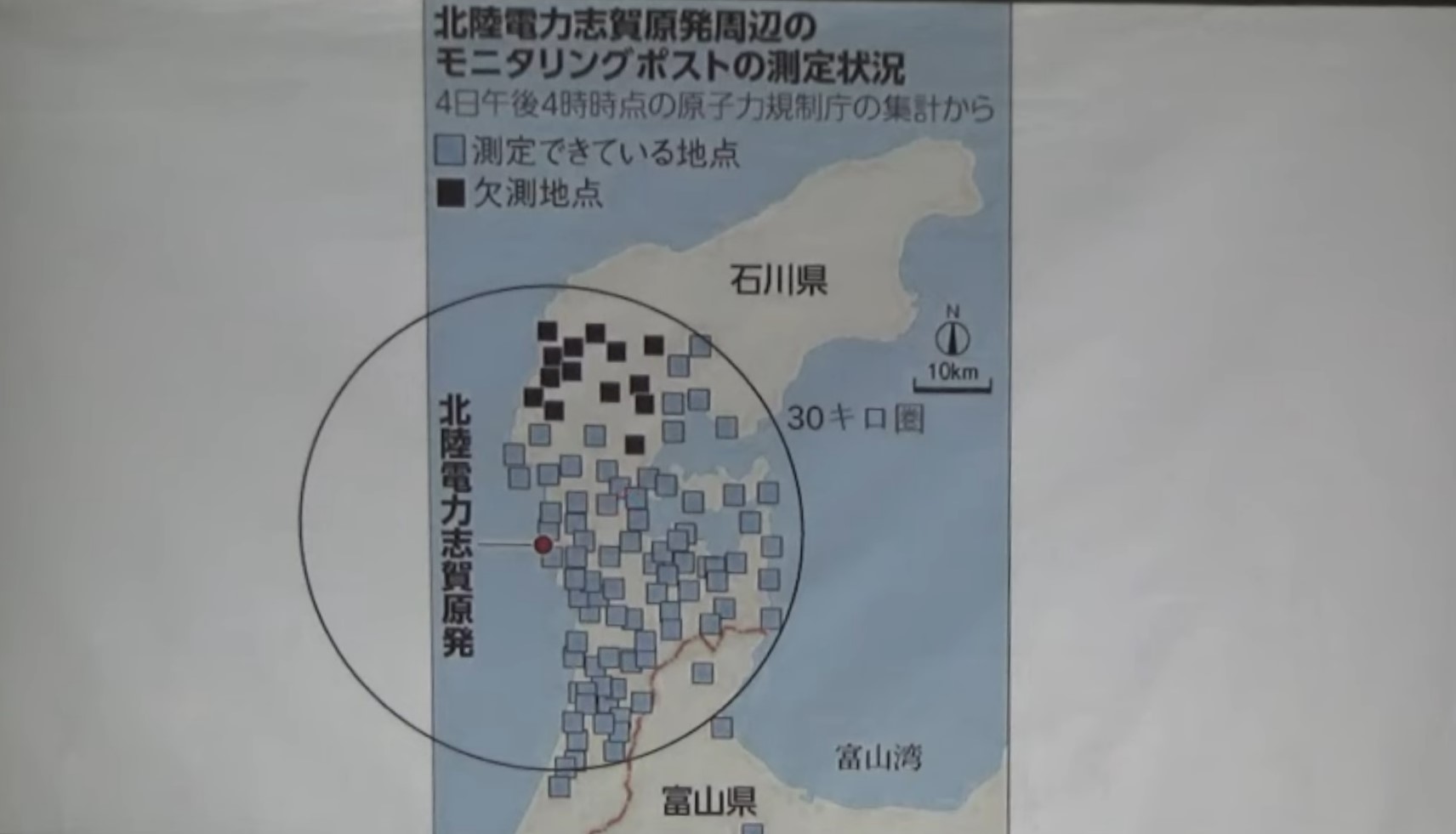 14:71 [ 動画先頭:1:34:51〜 ] [ レジュメ参照元 ] それがさらにこの図です。 これは原発の周辺にあるモニタリングポストの状況を表しています。 南側は震度も小さいし、電気も来ているので当然測定できているんですが、北側見てください、黒いのが全部停止しているわけです。欠測と書いてあります。 これは石川県が設置した30キロ圏内にあるモニタリングポストでして、これが破壊されて、どうして止まっているかは、全部わかっているわけではないので、破壊とは限りませんが、電力が止まっただけなのかもしれません。バッテリーが切れたとかね。 そういっただけかもしれませんけども、いずれにしても30キロ圏内の、最も主要な場所、5キロ圏内は直ちに避難、30キロ圏内が屋内退避ということを考えるならば、屋内回避する基準というのは、空間線量から決めます。 空間線量がどのくらいまで上がったら、どれくらい超えたら避難開始ですよ。避難開始しなくちゃいけないかもしれない放射能が向かっているかもしれない、というのを、どうやって知るのかといえば、モニタリングポストなんです。それが機能していなかったら、その肝心な情報が伝わらないわけですね。 これは飯館村事件なんです。飯館村というのは福島第一原発から見て50km以上離れたところでした。したがってモニタリングポストもほとんどないんですね。 そんな遠い所に作る必要があると思っていなかった。そうすると、飯館村でも放射性物質が飛んできて、環境放射線量がどんどん上がっていった、それに対して、測定する方法が住民には、なかったので、どのくらいの放射能が迫っているかわからなかった。 現地に原子炉研究開発機構の人間が入っていって、空間線量を測定してみたら、驚くべき高さ、年間百ミリシーベルト超えるかもしれない、という値がでて来る。それでは大変だ。逃げなくちゃいけないって指示出したいんだけれども、原子力研究開発機構には避難指示出す権限なんかありませんので、これは大変だということで、情報だけ持ち帰るんですが、その時そばにいた住民にこんな所に行っちゃいけない逃げた方がいいと言った人がいるらしいんです。ね。そんなこと言われても逃げられないですよね。 それと同じ現象で起きる可能性があったわけですね、もしも放射を放出していれば、この人たちは空間線量を測ることもできずに、モニタリングコストの欠測ですから、放射能が来ているんだかいないかもわからないまま放置される。 これが地名で言うたら、これは輪島市ですね。輪島市がそういう悲惨な状況に追い込まれる状況になりかけていた。もちろん放射能は今回出てませんから、そういうことは現実には起きなかった。ですけれども、もしも志賀原発でそういう環境への大量の放射能放出事故が起きたとするならば、この地震でここが欠測するんですから、ここで地震がおきれば、この辺が欠測するのではないか。。 結局モニタリングポストによって空間線量を図り、屋内退避なのか、それとも避難指示なのか、それを判断するという、その仕組み自体が崩壊している。ということなんです。 空間線量すら測定できない状態で、どうやって逃げるんですか。それが分からない状況を出現させてしまったと。いうことはこれは重大な問題なんです。 ![]() |