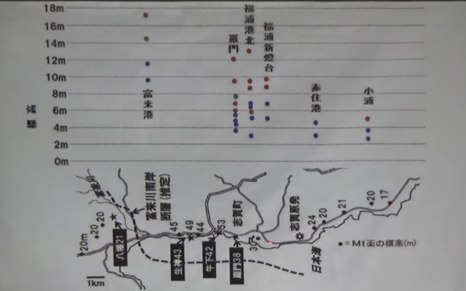 14:60 [ 動画先頭:1:23:54〜 ] [ レジュメ参照元 ] どのくらい上がったのかということを、今度は記録で見てみましょう。志賀町の富来港、過去の高いところを、みると、17メートルぐらい、次は14メートルぐらい、その次11メートル台、その次が9メートル台、要は4段階の隆起の跡が残っている。 観光地で有名な巌門(がんもん)、ここもたくさんの離水ベンチがありますよね。9か所あります。 巌門というのは、巨大な岩が海にせりだしているような巌門洞窟があって、沖合に大きな島がある。巌門3.8メートルと書いてあります。志賀町の志賀原発にそんなに遠くないところです。 それからこの辺見ていただくと、港があった赤住の標高なんか2.4、2.2メートル、2.1メートル、2.0メートル、1.7メートル。これだけ、隆起した跡が残っているということです。 赤住港でもそうですし、これは赤住港と巌門の間に原発があるわけです。志賀原発の目の前の岩もそのくらいの隆起はあったことになります。志賀原発地震も離水ベンチの上に建っている。ただ11メートルあるといって喜んではいけません。11メートルなんでできたんですかといえば、何回かの隆起の挙句に11メートルになっている。 そういう風に考えたらその11メートルに立っている原発が、次の地震で海抜何メートルになるのか、その間に敷地内の配管やあるいはケーブルそれから取水口が破壊されない保証はどこにあるのか。ということを問いただしなければいけないということです。 ![]() |