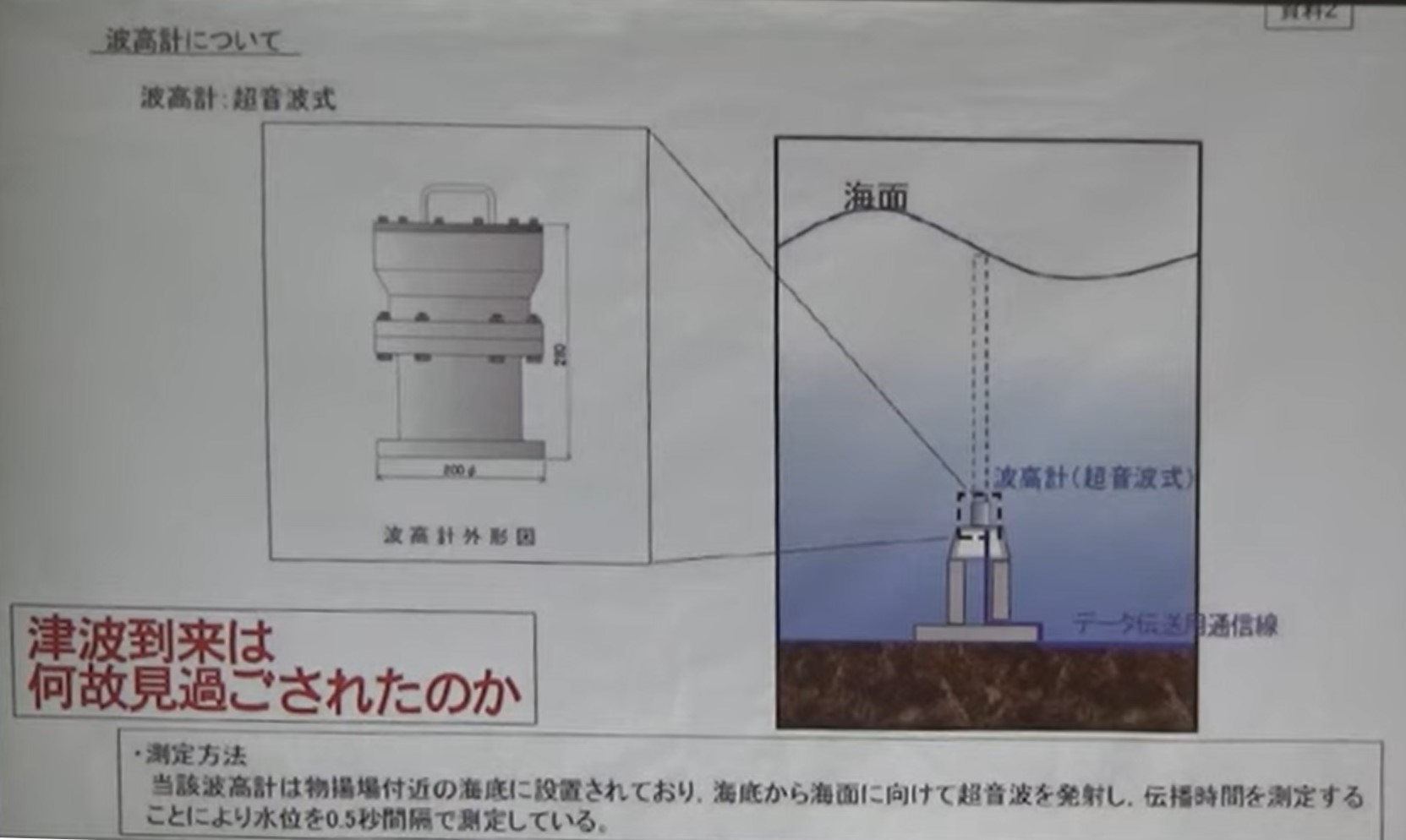 こういう波高計がちゃんとあったんですね、波高計によって、水面の変動がわかりましたので、それによって、津波が来たならば、何メートルの津波襲来とか、直ちに所内にですね、緊急事態の発令をして、所員は津波にのまれては困りますから、福島第一の場合は二人の従業員が死んでますので、そういうことを避けるために、津波襲来の警報が出たら、すぐに退避するという作業が必要になるのですけども。漫然と時をすごしたということになる。
