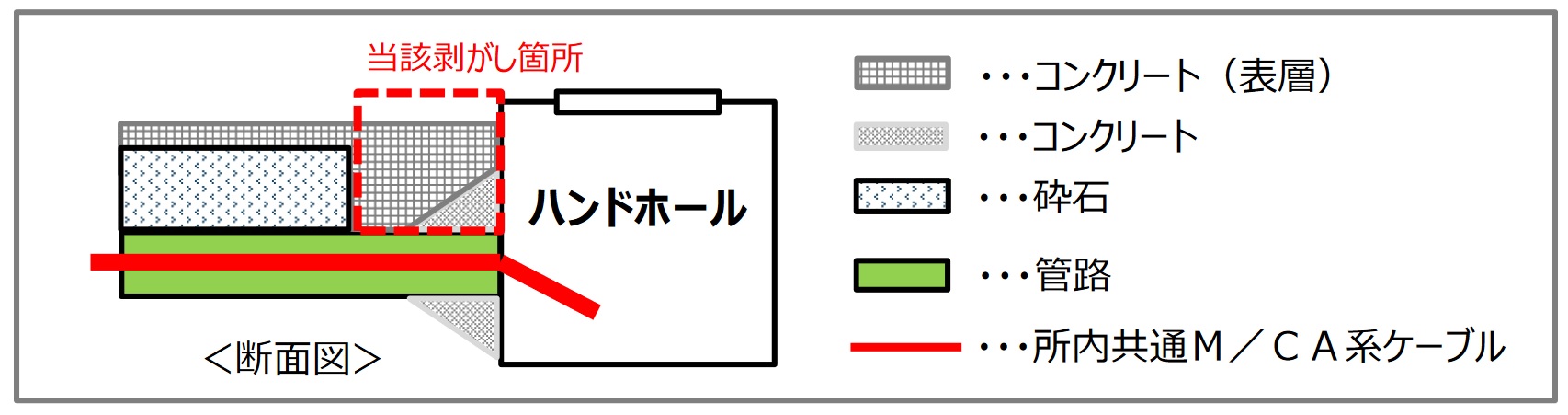 ・当該剥がし箇所(ハンドホール近接部)は、コンクリート舗装面と、埋設管路とハンドホールを固定しているコンクリート部とが一体構造となっていた。