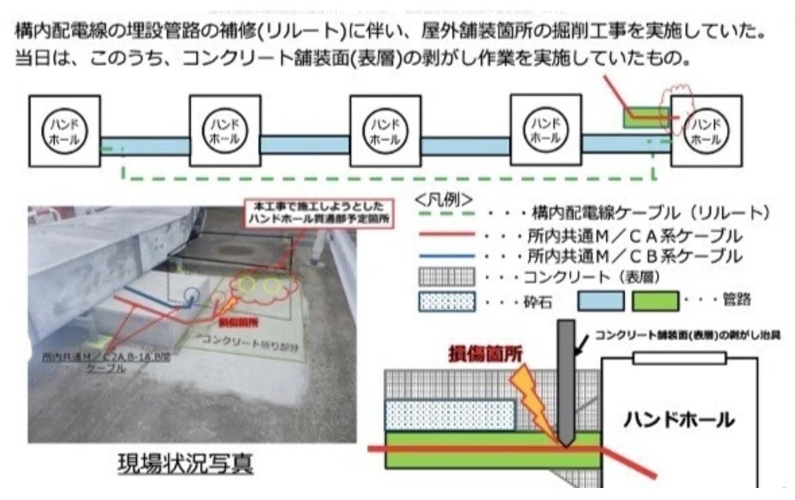 ・所内電源A系が停止した同時刻に、構内の大型機器点検建屋西側において、掘削作業(コンクリート舗装面(表層)の剥がし作業)に従事していた協力企業作業員の負傷が確認されております。現場状況を確認したところ、当該掘削作業によりケーブルが損傷し、所内電源A系が停止したものです。
