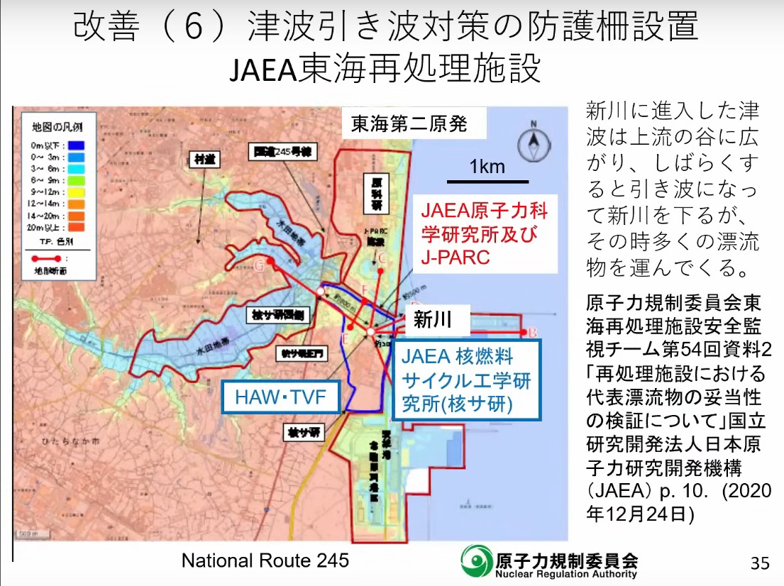 15:30 ![]() 【石渡】 それから、1番最初に津波の話をしましたが、この津波の引き波対策の話です。これは原子炉ではないんですけれども、この研究開発法人、日本原子力研究開発機構のいわゆる再処理施設がここの核サ研と呼ばれている、このところがございます。ここに使用済みというか、ここは再処理の研究をするとこなので、その燃料を細かく裁断してそれを溶かして、その溶かした液体が多量に保管されています。 津波が来た場合に外に流れると非常に困るわけで、ここは新規制基準には適合してないんですけれども、その液体をとにかく早く処理してガラス固化してくださいということで、操業が許可されております。 で時々止まって、あんまり順調には進んでいないんですが、ここに、もし今の時点で津波が来た場合、やはり非常にまずいので、柵を設けます、特に漂流物が衝突すると、建屋が壊れてしまって、まずいことになりますから、津波の漂流物、例えば車とかバスとか家とか、そういうものは流れてきても大丈夫なように、柵を作ります。 ※以下は編集者の注である。 当図は 「再処理施設における代表漂流物の妥当性の検証について」 の15ページ目の図の引用である。 |