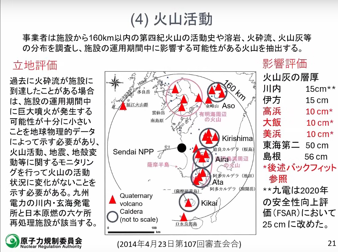 15:30 ![]() 【石渡】 火山活動ですけれども、これは半径160kmにある火山を全て調査をするということになっております。立地評価と影響評価、両方やります。立地評価は、主に火災流、大規模火災流が来ないかどうかと、来る可能性がある場合には、その火山がすぐにその大規模噴火をするような火山ではない、ということを証明していただいて、その上で動かした後も、モニタリングをやっていただく、ということになっております。 影響評価の方は、火山灰が降っても大丈夫です、という評価をしているわけです。これについてもバックフィットをやりました。 |