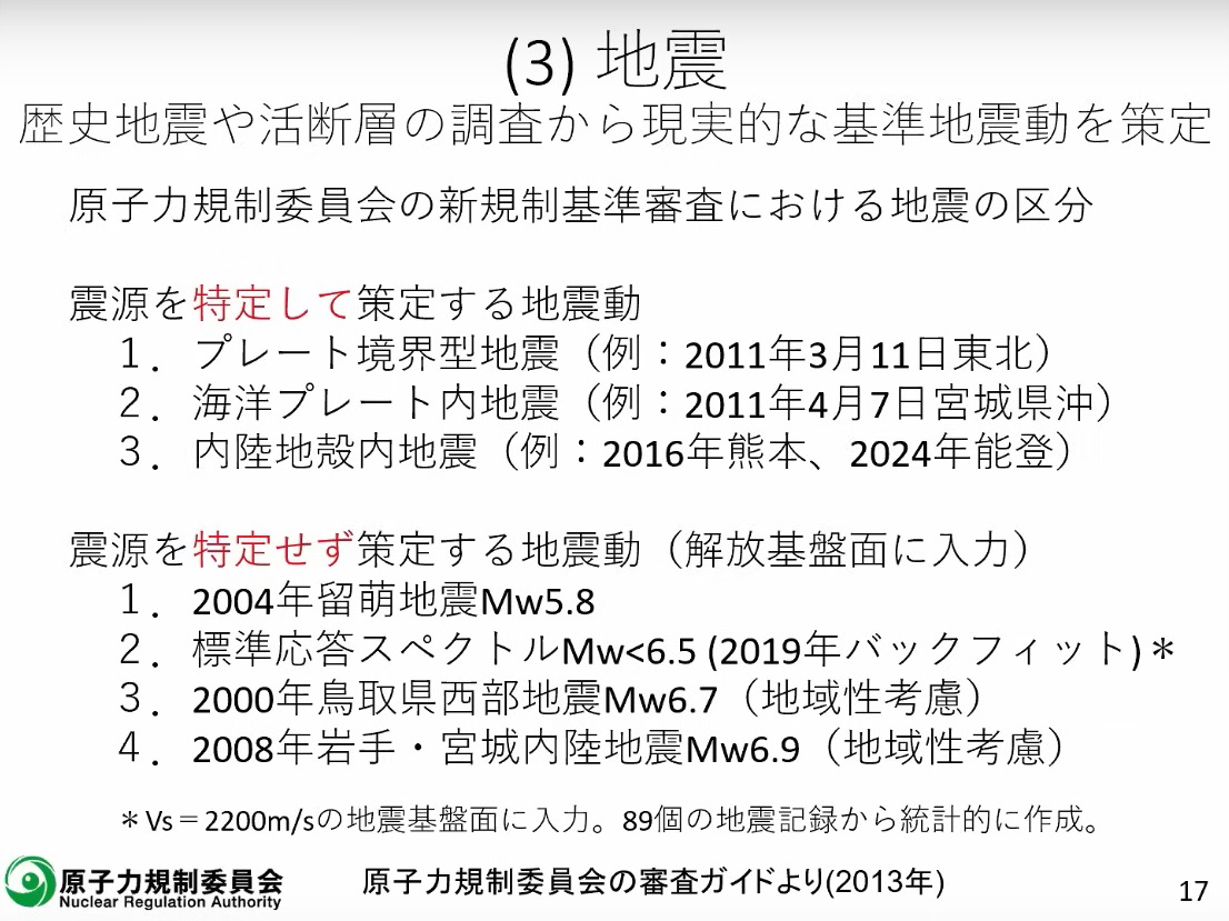 15:30 ![]() 【石渡】 次に地震です。この地震はこれは、「活断層等」、特に敷地に近い活断層がずれますと、大きな振動が来るということで、この「震源を特定して策定する地震」と、これは活断層の位置が分かっている場合、それから、「震源を特定せず策定する地震動」、これはもう震源がどこにあろうが関係なく、原子炉の直下に地震動を入力するというやり方をする、地震動の審査でこれについては、このバックフィットをかけました。 例えばこの「震源を特定せず策定する地震」として、この2004年に北海道で発生した留萌地震、この地震波を原子炉の下に入れるということで、今まで審査をしていました。 実は審査ガイドには、この地震を考慮しなさいっていうことは、もちろん書いてあるんですけど、それ以外に13個の地震がリストアップしてあって、これについても考慮しなさいということになっていたんです。これは審査ガイドにリストが載っています。 我々は電力会社の社長さんとかとお話をする時に、いつもこの留萌地震1つでは非常に心もとないので、他の地震についても、ちゃんと解析して、それを「震源を特定せず策定する地震」の入力地震動として、おたくの原子力発電所に入力して大丈夫かどうか確かめてくださいということを、いつも申し上げていたんですが、残念ながら事業者さんは、それを一向にやらなかったんです。 そこで、我々としては業を煮やしてですね、では自分たちでやりますということで、標準応答スペクトルというのを作りまして、これを全国の原発に原子力発電所に、バックフィットをかけました。この地震動を入れて、大丈夫かどうか判断をしてください、ということをお願いしたわけです。これも後でちょっとお話をします。 |
