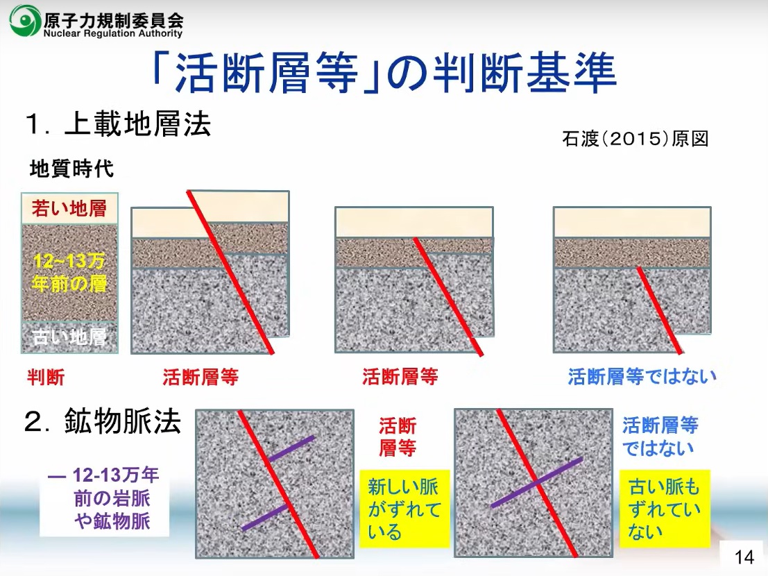 15:30 ![]() 【石渡】 では、その「活断層等「をどうやって判断するか、これ非常に単純です。この地層というのは古いものから新しいものへ重なっております。例えばこの真ん中この茶色い層が12〜13万年前としますと、下にはそれより古い地層があって、上には新しい地層があるわけです。 この新しい地層がずれてたら、これはアウト、ダメです。では12〜13年前の地層だけがずれていて、それより上の地層はずれていません。これもダメです。これ「活断層等」になります。では、その12〜13年前の地層はずれていませんが、その下がずれています。これはオッケーです、こういう判断基準ですね。 ただこういう地層が、いつもあるとは限らないわけです。こういう層がない場合も多いので、そういう時はどうするかというと、この鉱物脈法というのを使います。別に鉱物の脈じゃなくても、例えば岩脈でもいいんです。何でも目で見えるものでも、顕微鏡で見えるものでも何でもいいんです。 断層を貫いているか、断層に切られているかで、この脈が12〜13年前あるいはそれより新しい脈がこの断層に切られていたら、「活断層等」です。でも、これが全然切られていなければ、これはオッケーですと、こういう判断基準です。 この上載地層法と鉱物脈法というやり方、これで「活断層等」を判断してきました。 ※以下は編集者の注である。 当図は 「鉱物脈法による断層活動性評価について 石渡明」 の3ページ目の図に近い。 |