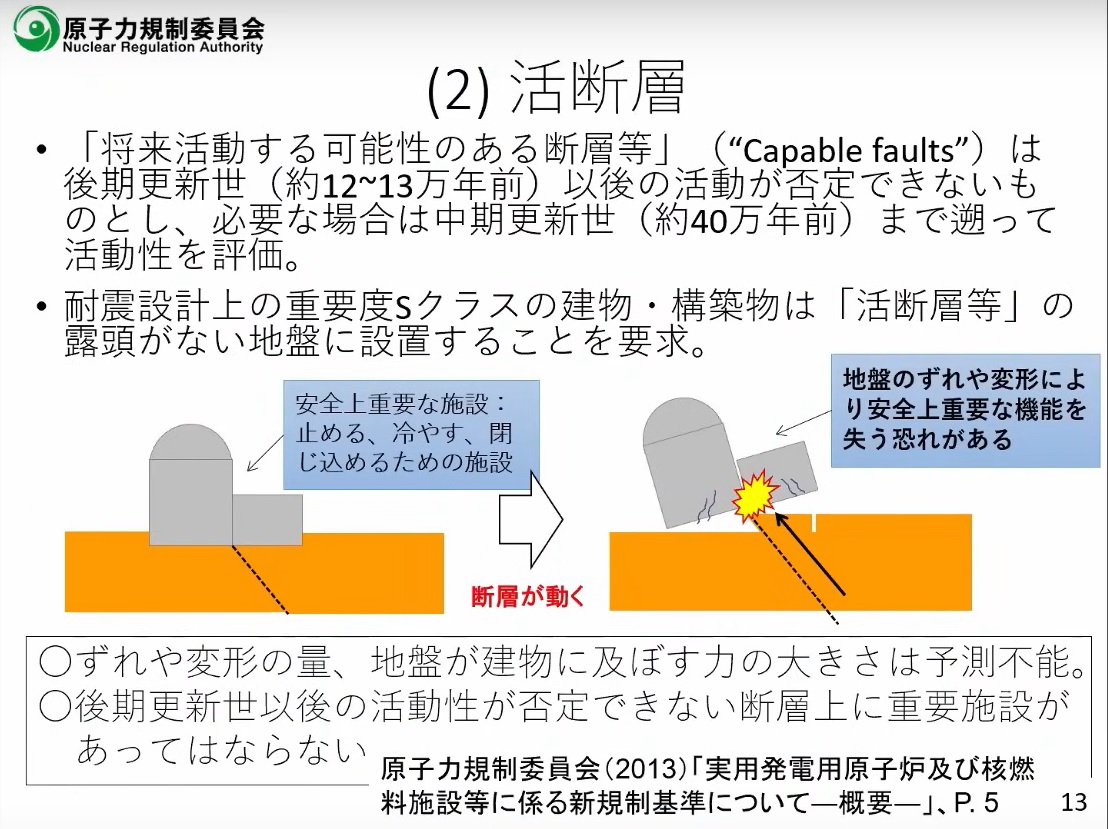 15:30 ![]() 【石渡】 次に活断層ですね。先ほどもご紹介がありました敦賀の話とかで、これも非常に大事な問題です。原子力の方では活断層っていう言葉はあんまり使わずに、この「将来活動する可能性のある断層等」という言い方をします。これは非常に持って回った言い方なんです。 英語では活断層っていうのは、アクティブフォールトと、普通言いいます。原子力関係ではこのケイパブルフォールト("Capable faults")っていう、地震を起こしうる断層、動きうる断層ということ、そういう言葉遣いがちょっと変わっております。 日本では、定義として、後期更新世(12〜13万年前)、これ以後に1度でも活動したもの、これを将来活動する可能性が否定できない断層というふうにします。 で、もしこれで決着がつかない場合は、40万年前まで遡って調べなさいということが、審査ガイドに書いてあります。耐震設計上の重要度Sクラス、一番重要な建物、原子炉とか、あるいはそのタービン建屋とか取水路とか、こういった建物は、この「活断層等」の露頭がない地盤に設置することを要求しております。これ規則で要求しているわけです。 もしこの建屋の下で実際に断層が動きますと、どういう影響が生じるか、なかなか予想がつかないということがございます。で、とにかく、こういう活断層の露頭があるところには、設置しないで下さい、ということになっているわけです。 ※以下は編集者の注である。 当図は 「実用発電用原子炉に係る 新規制基準について −概要− 原子力規制委員会」 の11ページ目の図に近い。 |